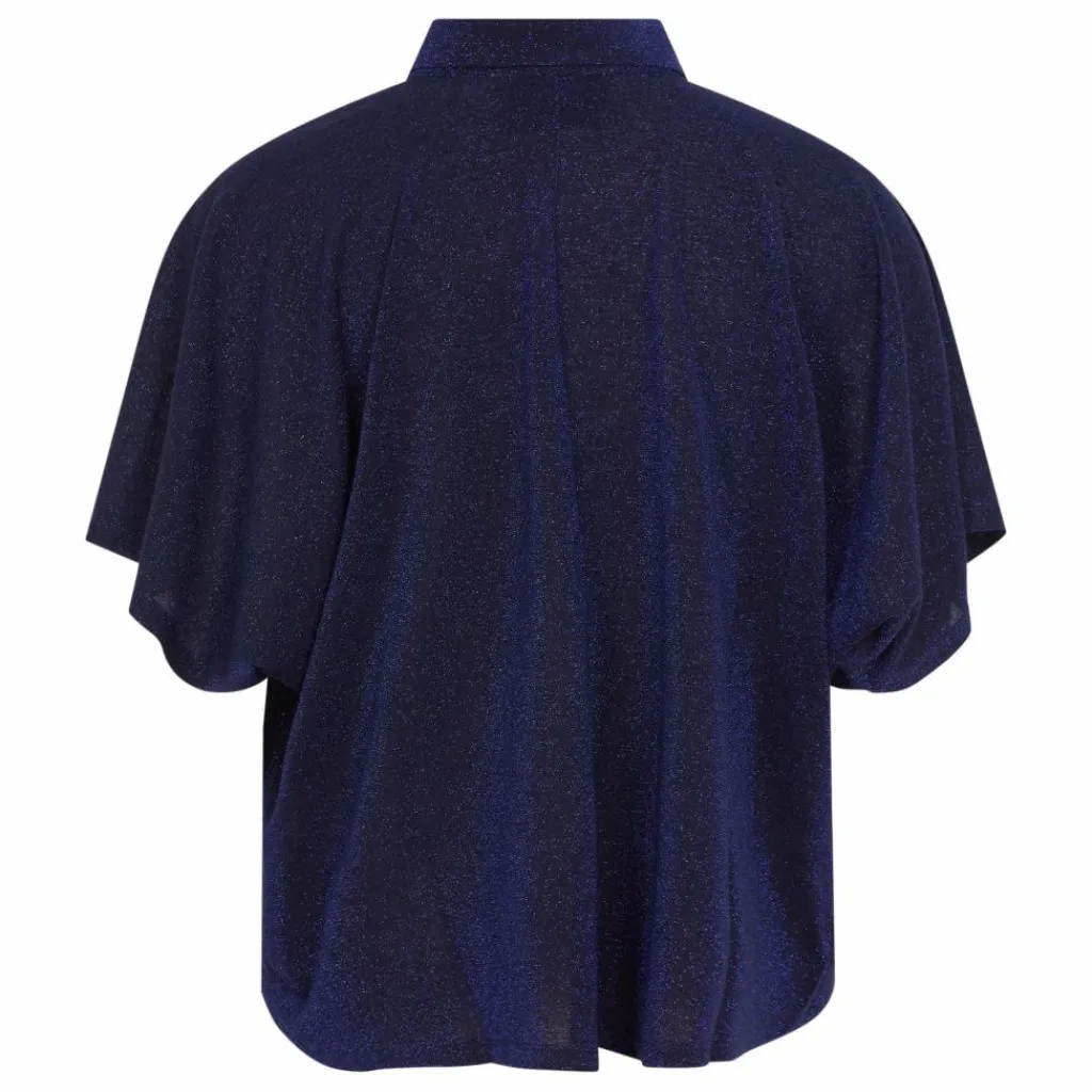 - Chemisier incontournable en jersey lurex à la ligne surdimensionnée soulignée par de larges manches courtes kimono. Boutonnage apparent et col classique.