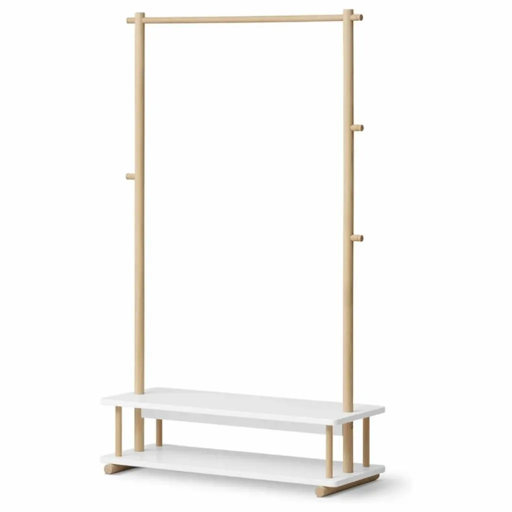 Le portant Camp, dont le design rappelle le cadre du lit à baldaquin, dispose de deux étagères en placage blanc sur lesquelles il est possible de ranger à la fois des chaussures de randonnée et des chaussons de danse. Ses détails ingénieux, comme de petites patères latérales installées le long de la belle structure en rondin de chêne, permettent aux enfants d’attraper et d’organiser toutes leurs affaires, de leur ciré à leur cape d’invisibilité.