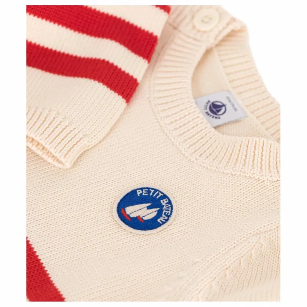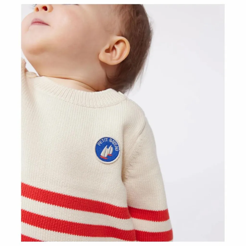 - Pull en coton pour bébés avec des rayures placées et un badge sur la poitrine