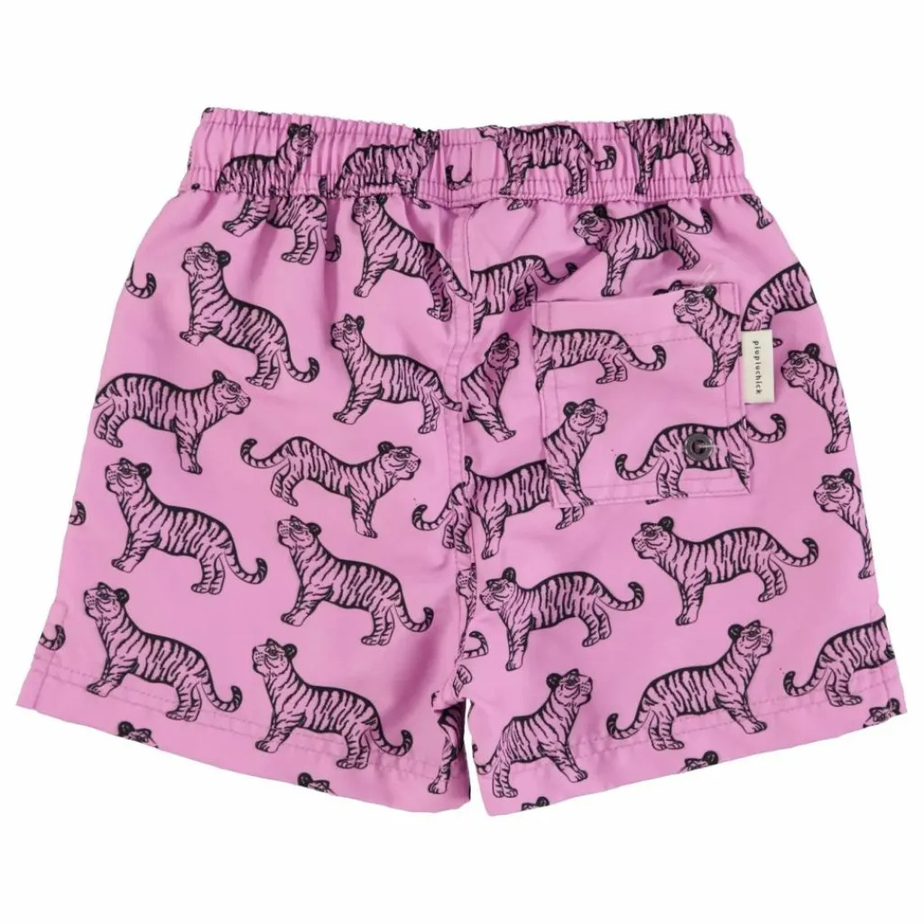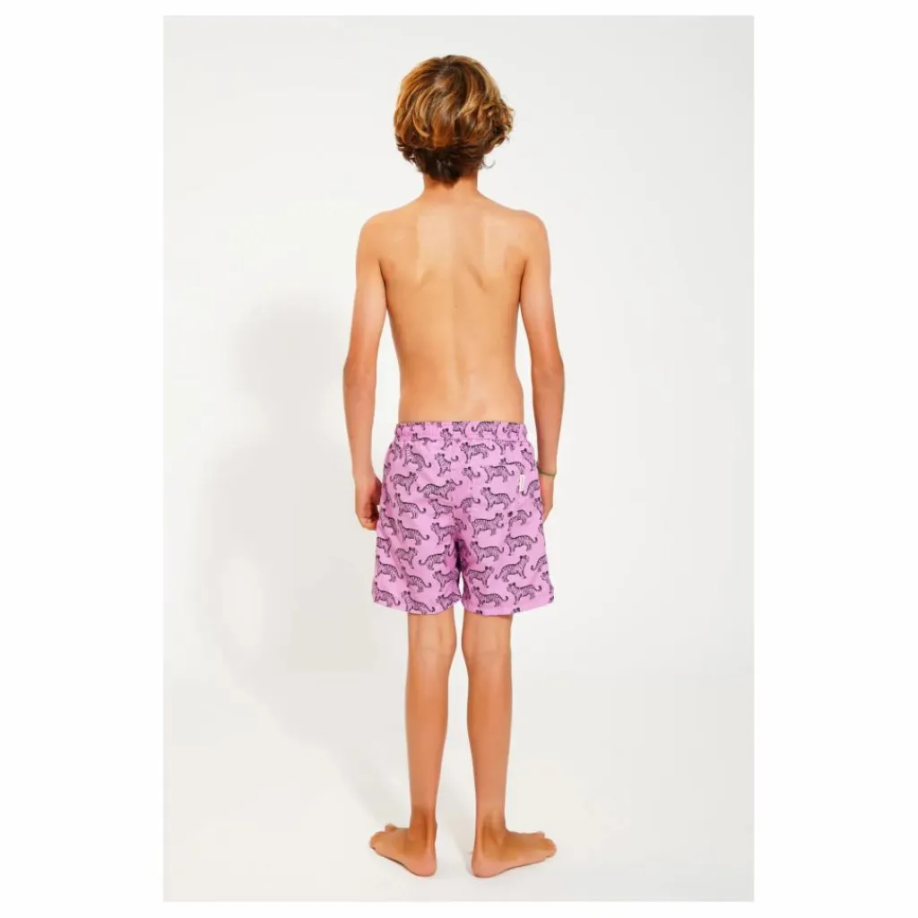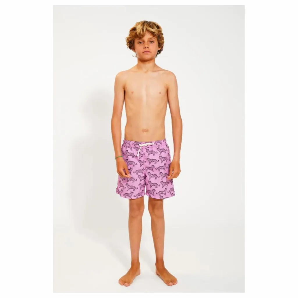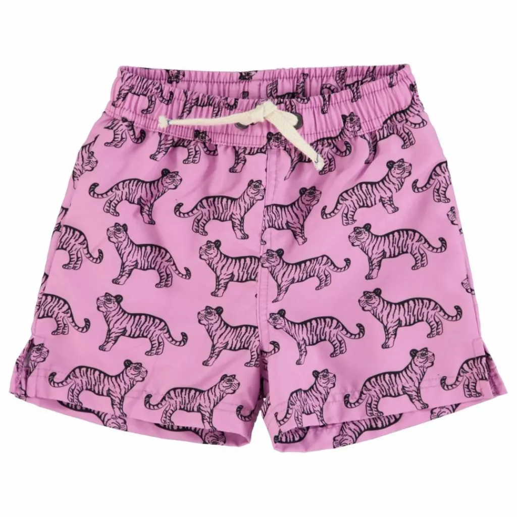 - Short de bain avec taille élastiquée et cordon de serrage, sous-vêtements en maille et fente sur le côté.