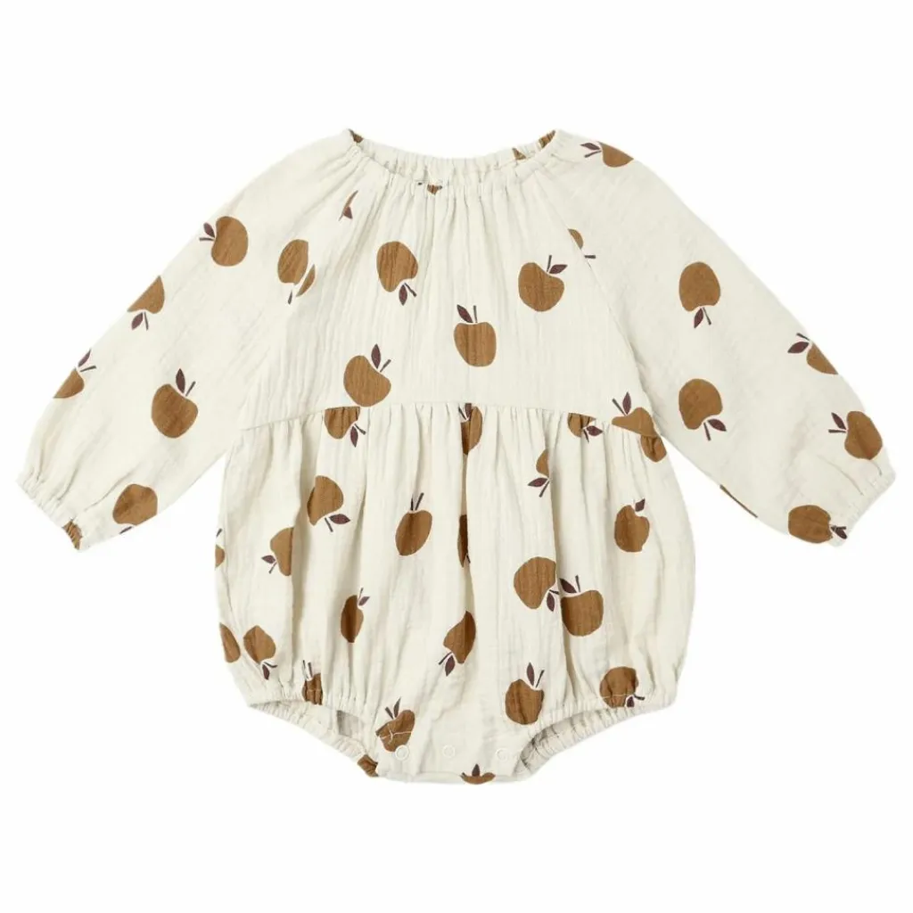 - Notre barboteuse à manches longues est conçue avec une encolure, des poignets et des ouvertures de jambes élastiques pour une coupe légèrement froncée, charmante et confortable, avec notre imprimé « pommes d’or » sur notre teinte « naturelle ».