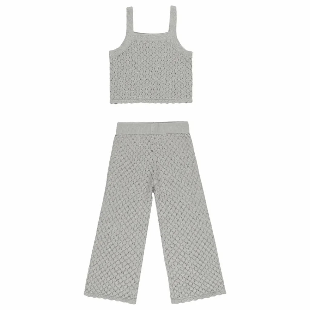 - Notre ensemble d’été en tricot se compose d’un débardeur court et d’un pantalon à jambe large à bord festonné. Il se distingue par sa teinte ‘seafoam’. Entretien : Laver à froid en machine. 100% coton.