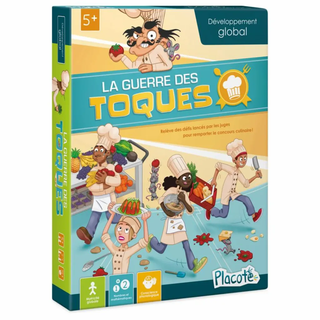 La Guerre des toques est un jeu de parcours compétitif conçu pour les chefs en herbe ! Chaque joueur incarne un apprenti cuisinier qui participe à une compétition culinaire passionnante. Le but du jeu est de répondre à différents types de questions posées par les juges pour récolter des ingrédients et créer une délicieuse recette.
