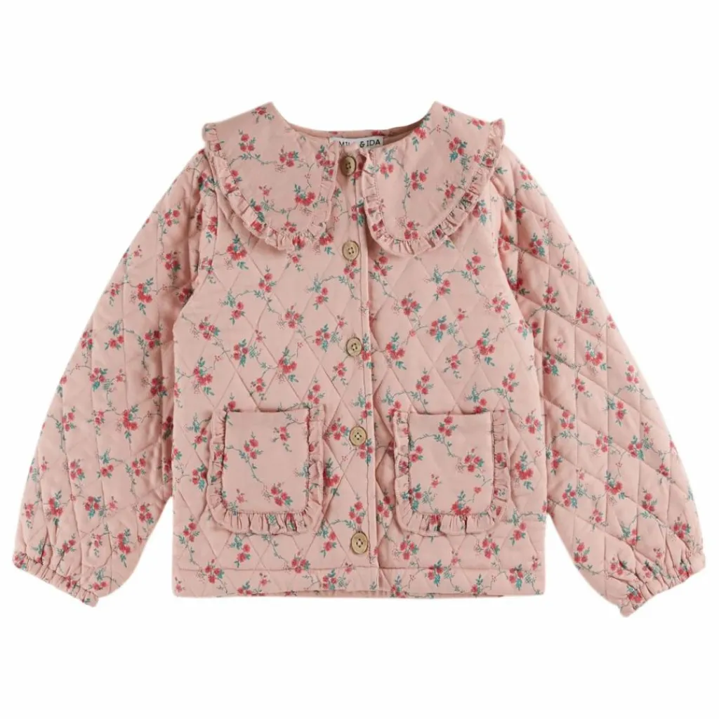 - Veste matelassée en coton ornée de bouquets fleuris sur fond rose.