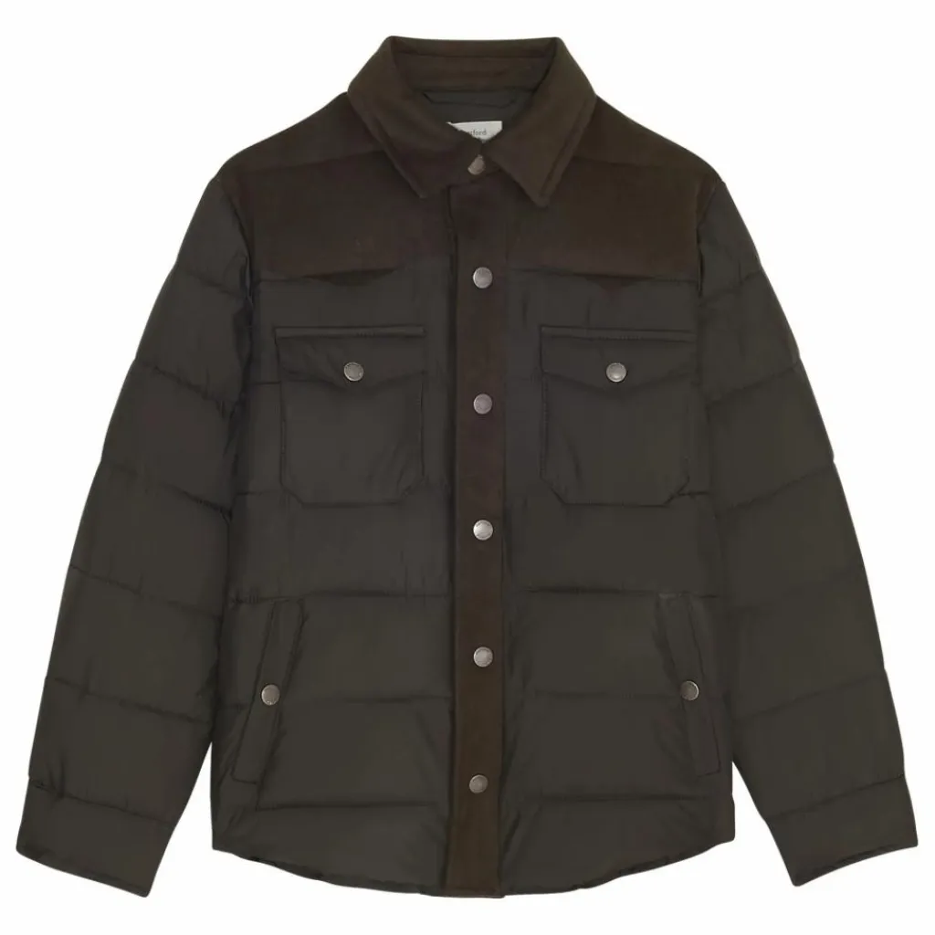 - Doudoune garçon matelassée avec empiècements caractéristiques en laine aux épaules et dans le dos. Patte de boutonnage à pression. Deux poches poitrines et deux poches passepoilées à pressions. Poignets ajustables par boutons à pression.