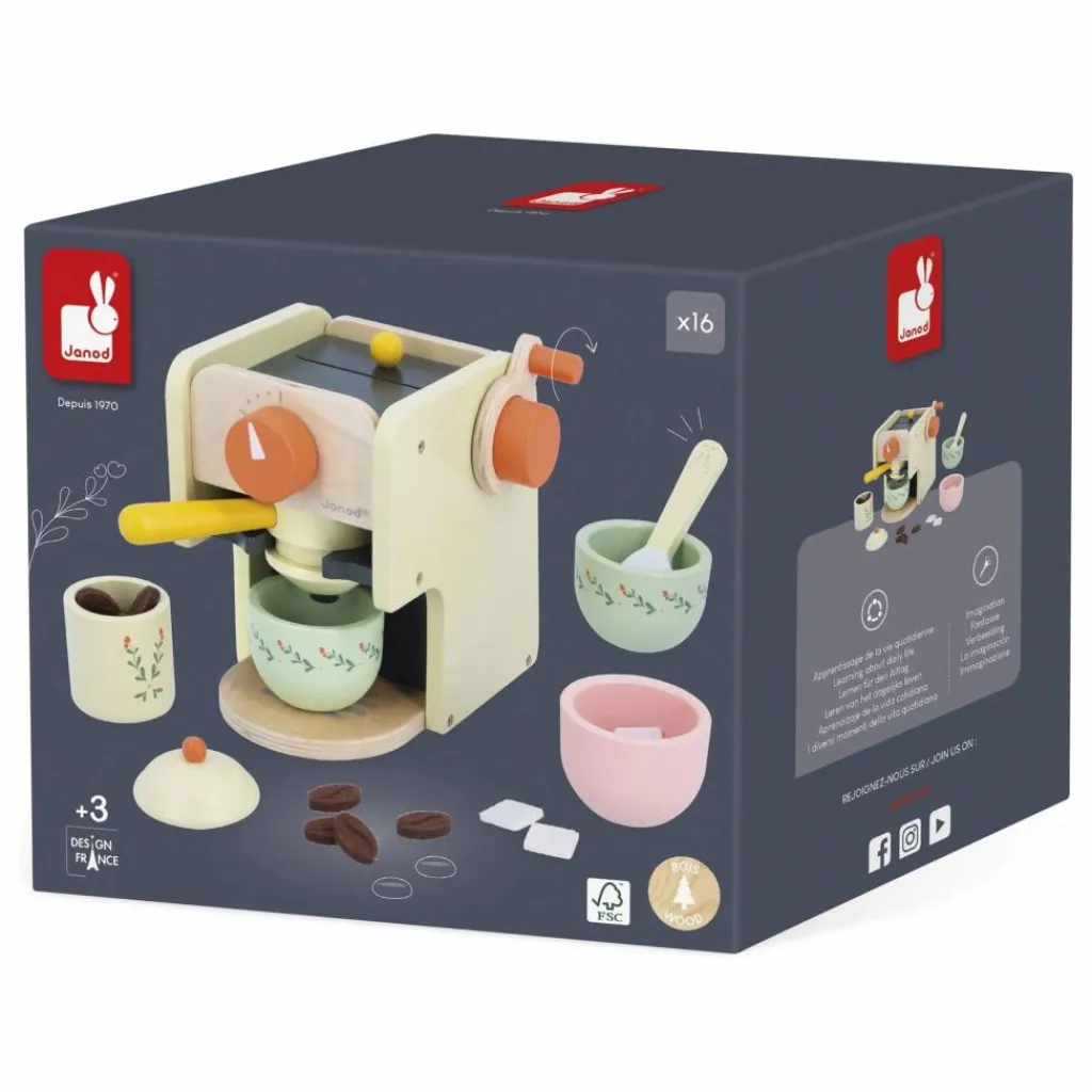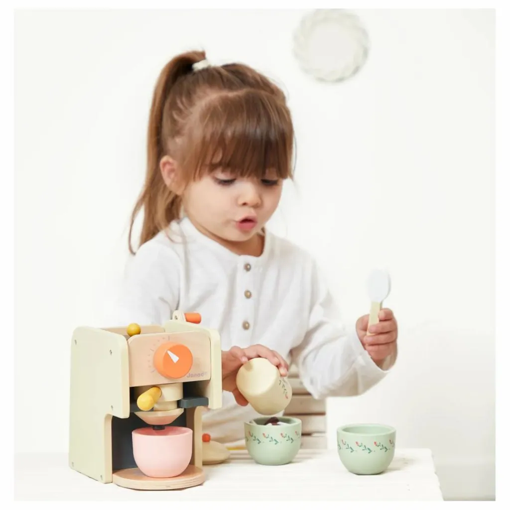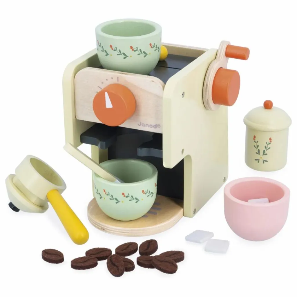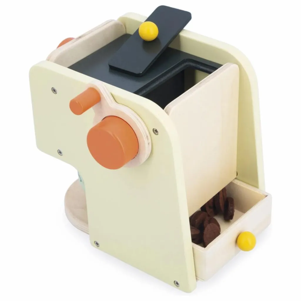 - Envie de devenir un véritable barista ? Cette machine à café aux nombreuses fonctionnalités est idéale pour faire couler et déguster de bons cafés bien chauds comme papa et maman. Sur la machine à café il y a une trappe sur le dessus pour glisser les grains de café à moudre. Cric – cric – cric, tournez la manivelle sur le côté et magie! Récupérez le marc de café dans le petit tiroir à l’arrière de la machine ! Les mettre dans la poignée porte-filtre, l’insérer dans la machine et la tourner d’un quart de tour pour la bloquer. Plus qu’à régler la taille du café ou sa température avec le bouton rotatif et sonore sur le devant. Le café est prêt ! Et si besoin, il est possible d’ajouter un sucre. Jouet d’imitation en bois FSCTM. Jouet pour les enfants à partir de 3 ans.