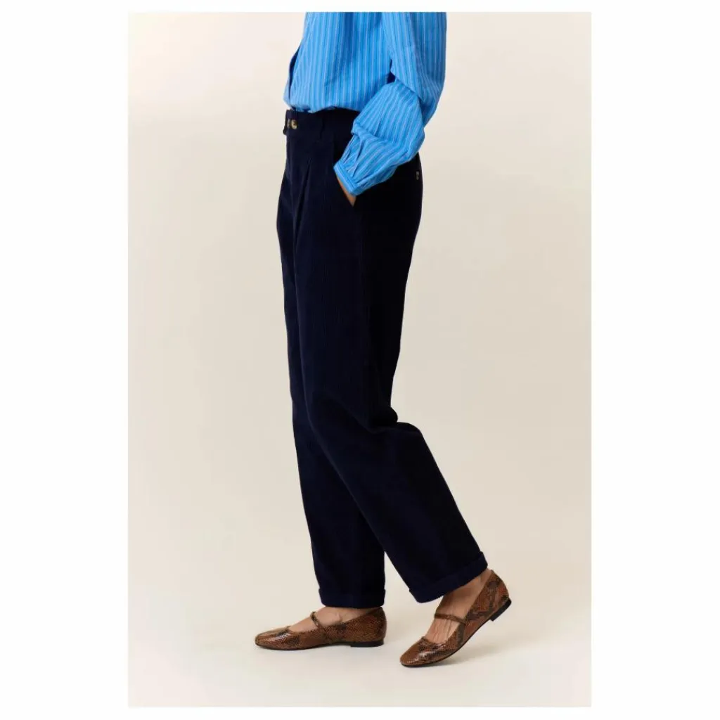 - Le pantalon Prom est le pantalon en velours de l’hiver. Avec sa coupe droite, ses pinces sur le devant et sa finition côtelée, il est idéal pour affronter le froid de l’hiver. La femme Leon & Harper le porte dépareillé ou en total look avec la veste Viviane.