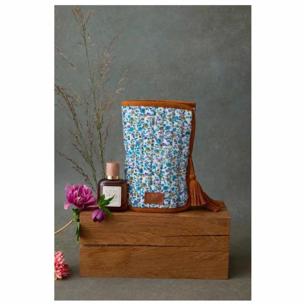Extérieur en velours milleraies fleuri et intérieur en voile de coton uni.