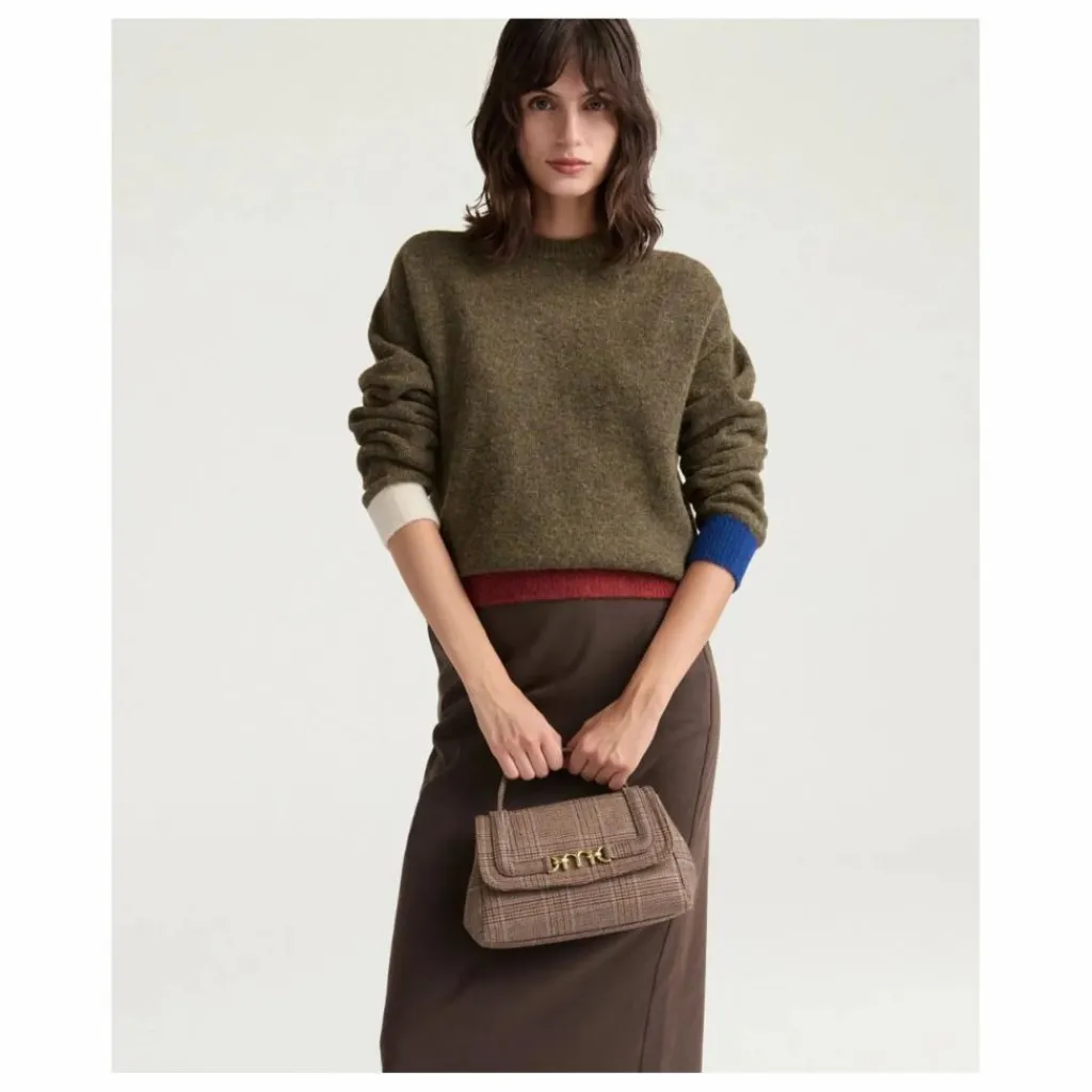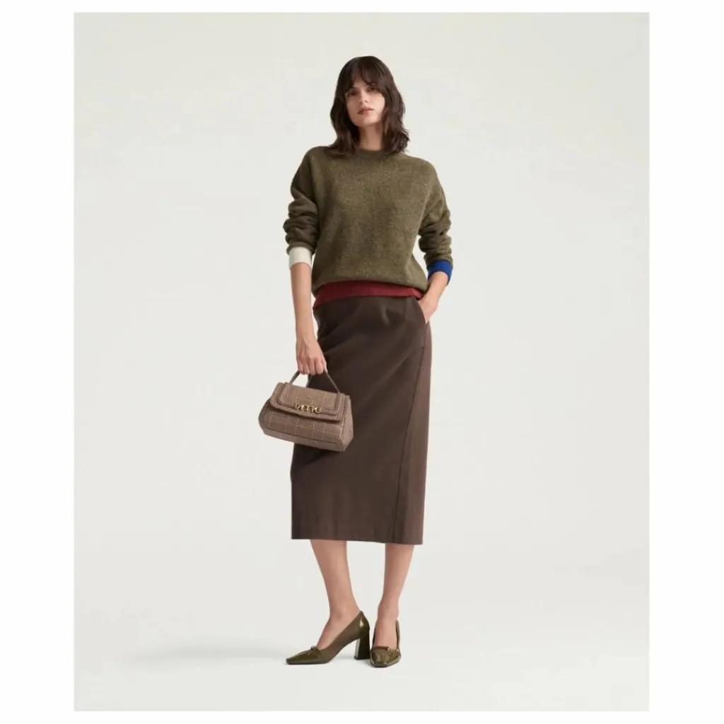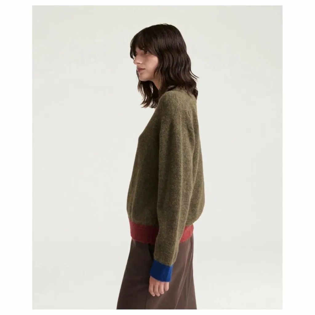 - Tricot ras-du-cou en doux fil de laine mérinos stretch au fini molletonné, coupe boxy, avec bas du vêtement et poignets en grosse côte.