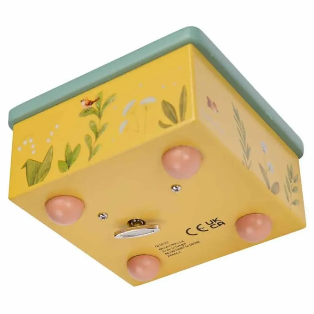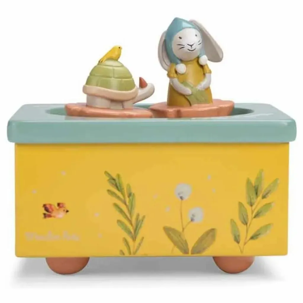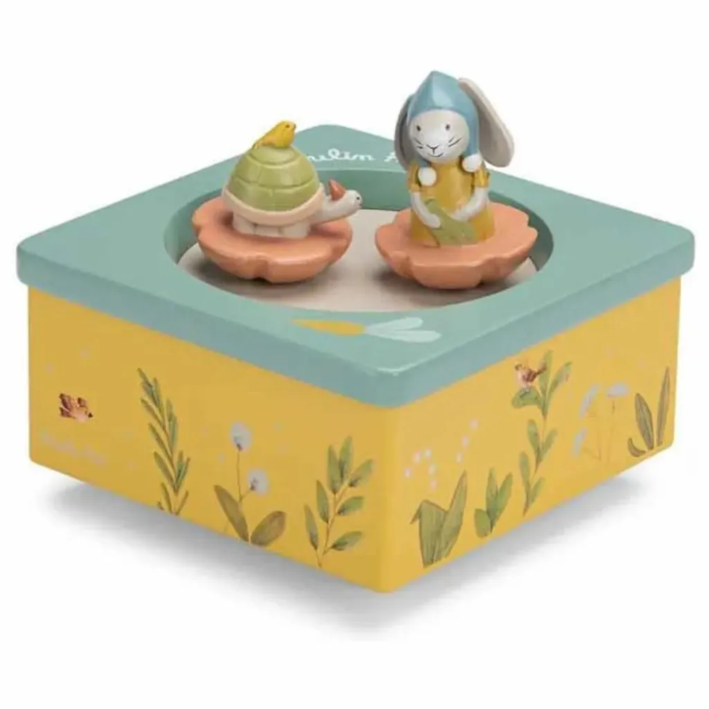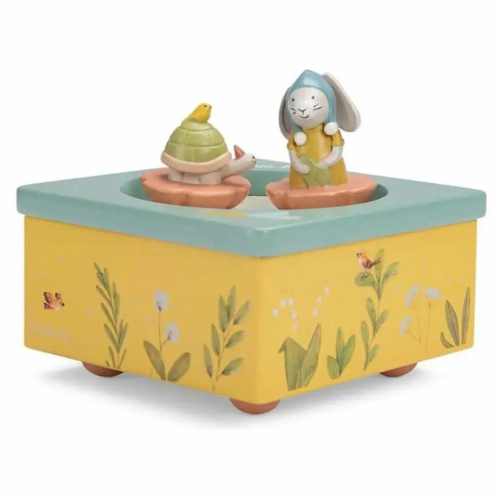 - Boîte à musique aux couleurs de la gamme, illustrée d’un joyeux paysage composé de plantes, légumes et petits oiseaux du jardin. Le lapin et la tortue tournent et dansent sur la piste pour bercer et endormir bébé.