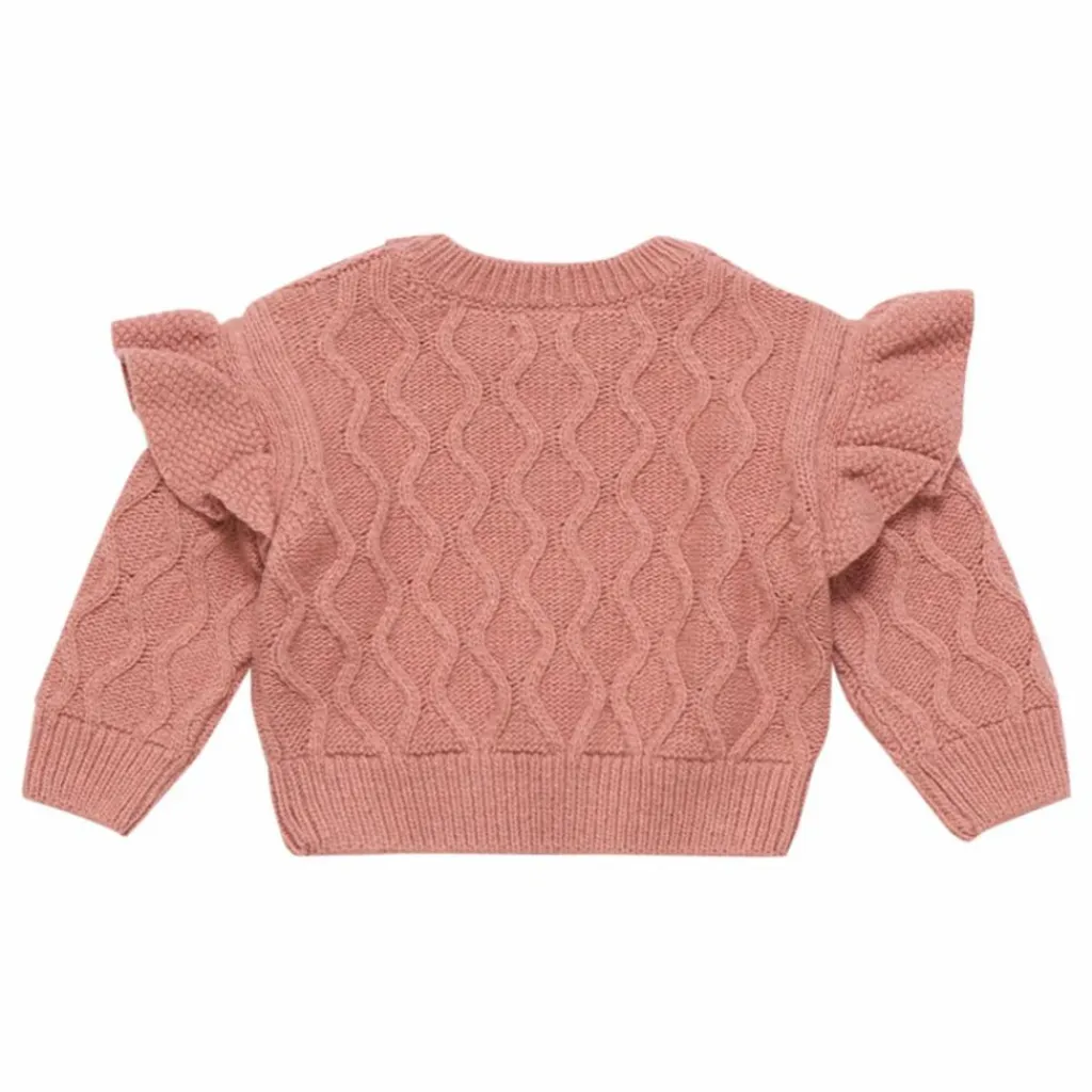 - Emmanchures volantées, Encolure ronde, Manches longues, Bords-côtes, Jeux de maille