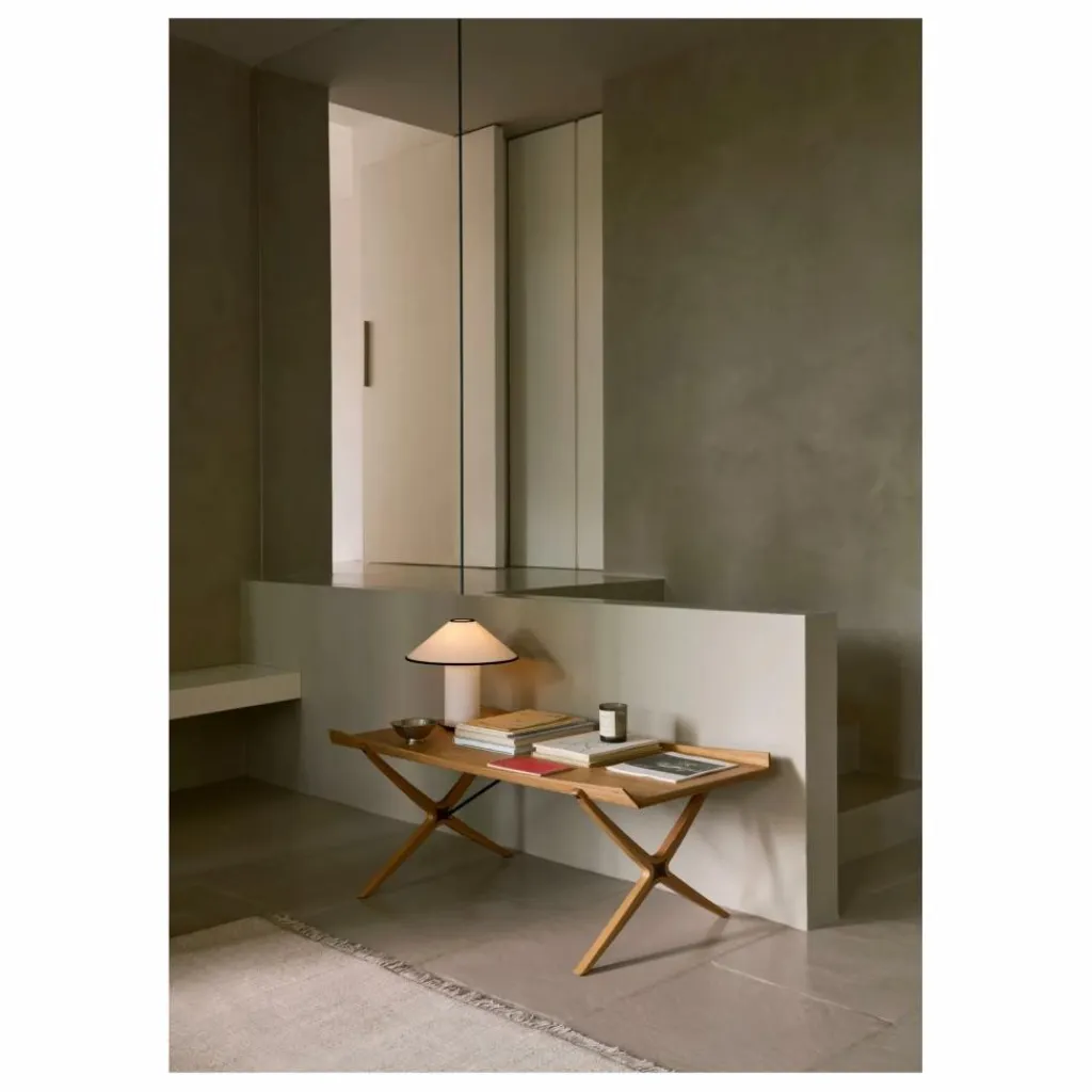 - Conçue à l’origine en 1959, la table X représente l’apogée du travail de Hvidt & Mølgaard en tant que collaborateurs créatifs. Remise au goût du jour à partir d’archives familiales, la table tire son design unique des anciennes chaises pliantes égyptiennes. Basée sur les mêmes principes que la chaise X, qu’elle devait compléter à l’origine, la table X présente le même cadre incliné et la même utilisation judicieuse des matériaux.