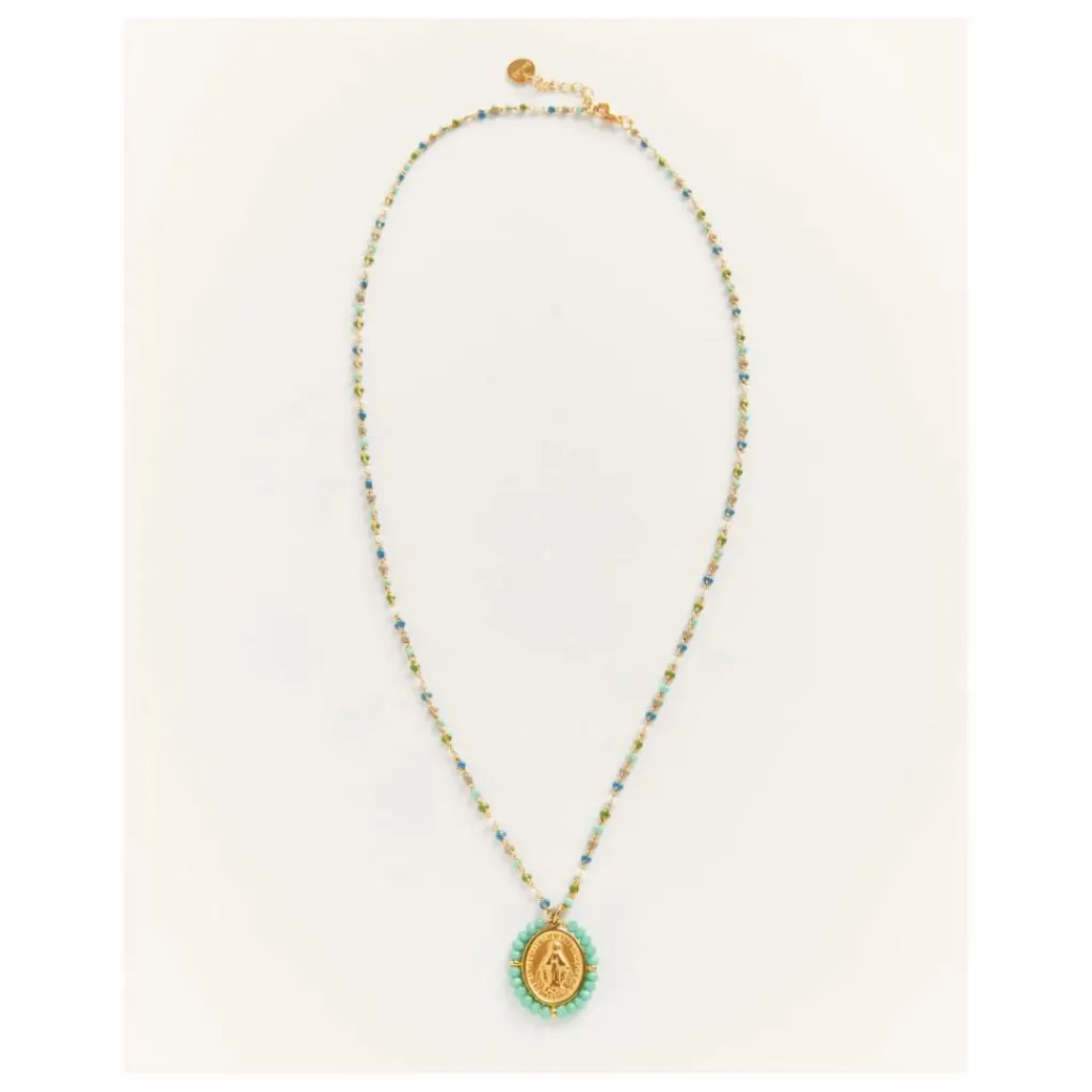 De fines perles azur subliment la chaîne en acier doré et la médaille Santa.