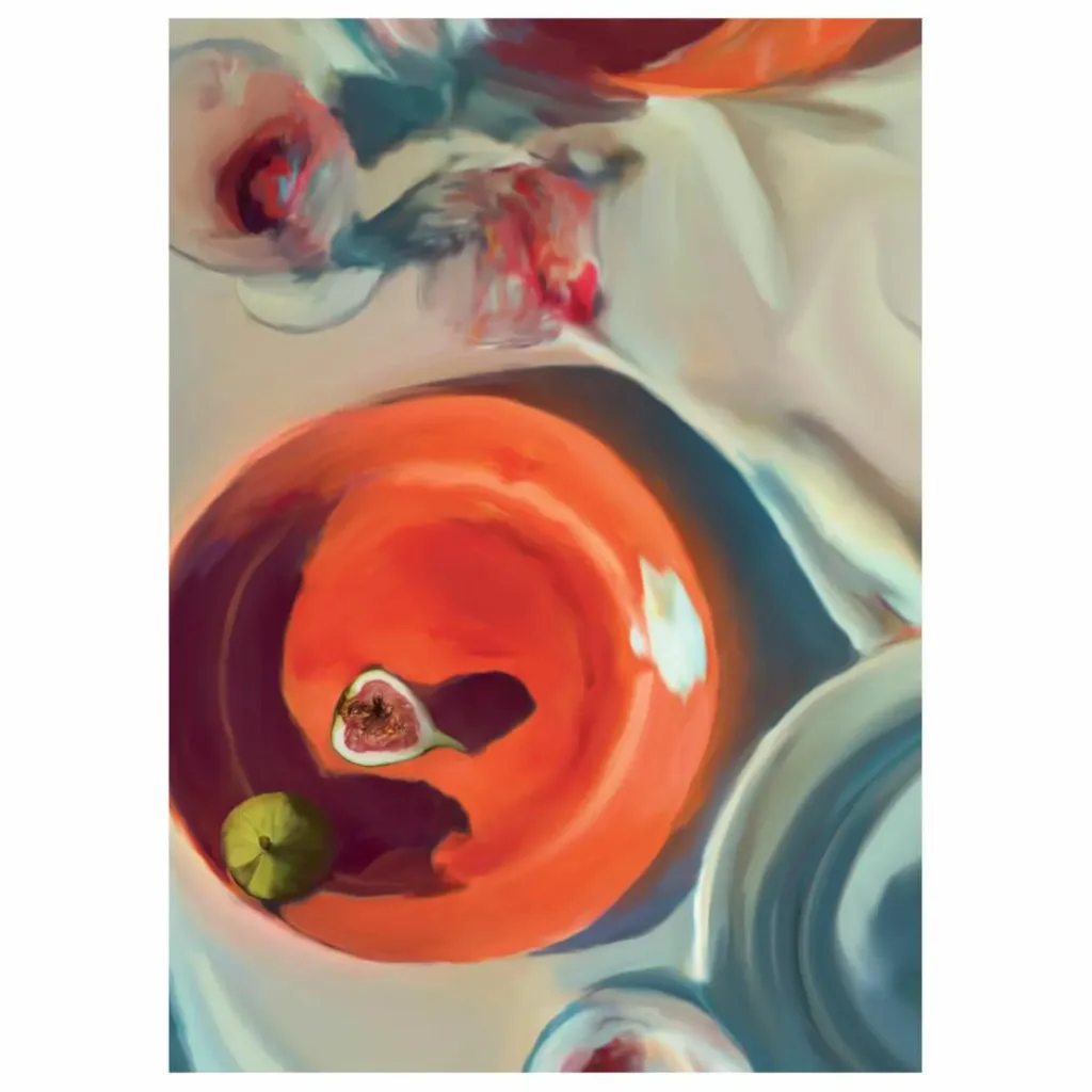 - Fine Dining du groupe artistique danois Misfitting Things représente un dîner brumeux après la consommation d’une ou deux bouteilles de vin. Magnifiquement texturée grâce aux techniques de peinture numérique de l’artiste, la scène joue avec une touche de psychédélisme alors que les ombres et les reflets commencent à s’estomper et à tourner dans le soir. Sur un fond blanc, une assiette d’un rouge éclatant est ponctuée de figues mûres. Une impression d’art / affiche fabriquée au Danemark à partir de matériaux et d’une production certifiés écologiques.