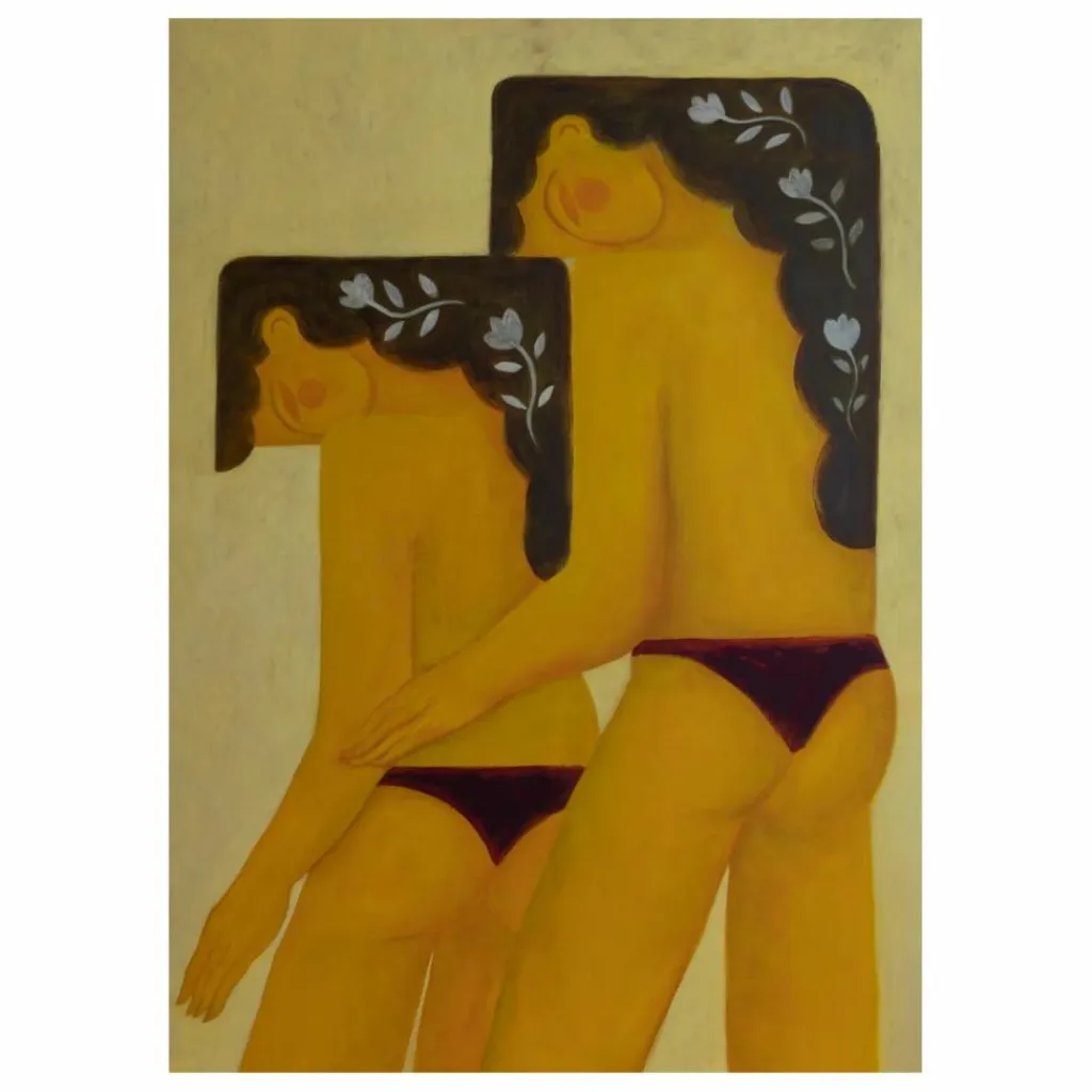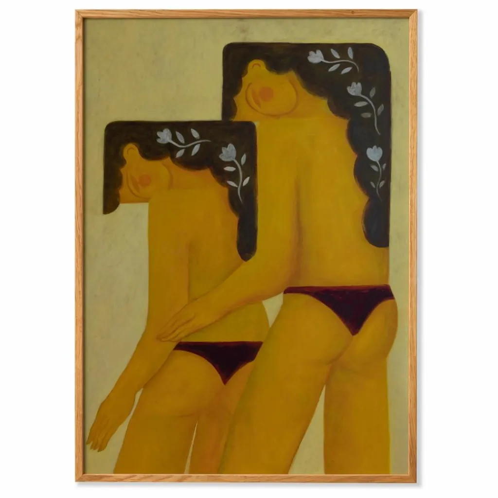 - Complete de l’artiste danoise Sara Mai explore les concepts d’interaction humaine et d’acceptation sociale. Équilibrant les représentations organiques et géométriques de la forme humaine, deux figures féminines se tiennent l’une l’autre en signe de soutien. Riche en textures, Mai a utilisé de la peinture acrylique sur toile dans des tons jaunes dominants, contrebalancés par du noir et du violet profond.