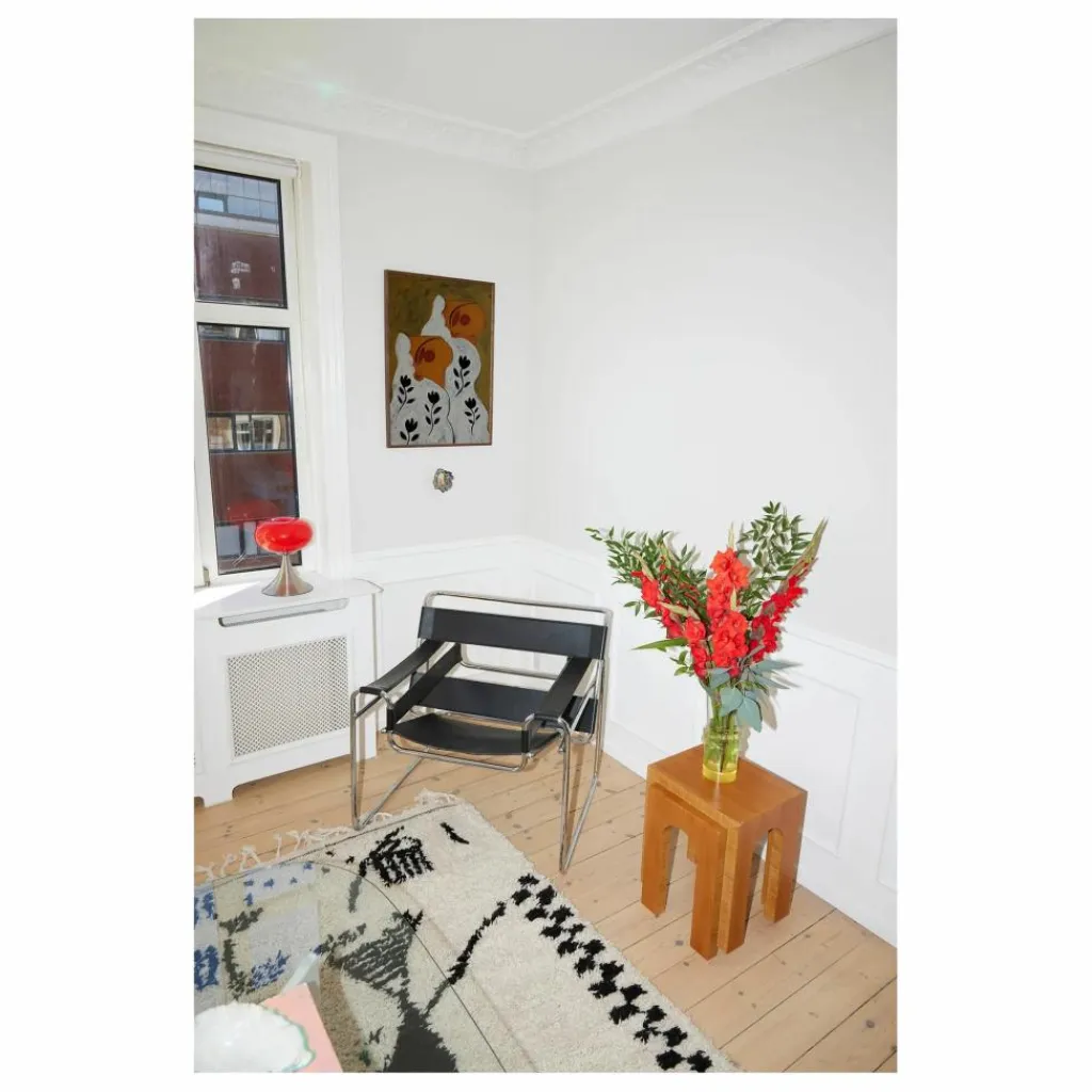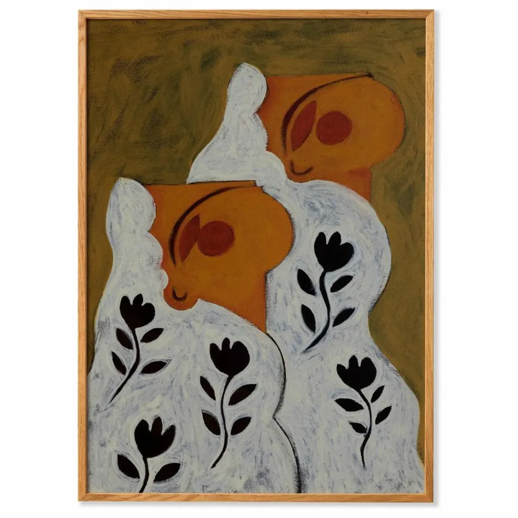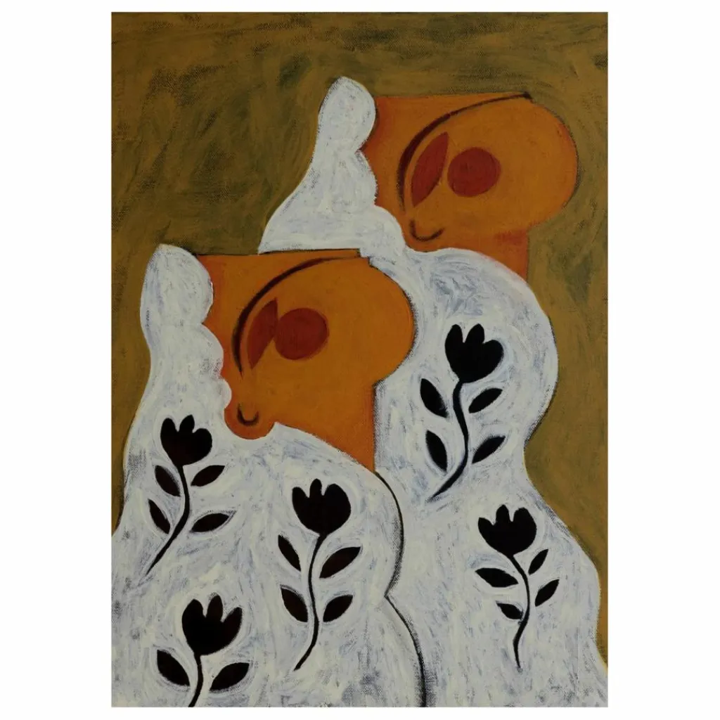 - Panna Cotta de l’artiste Sara Mai, basée à Copenhague, met en scène deux sujets liés par un moment de bonheur. Les deux figures abstraites semblent unies par un repas partagé, leurs visages s’illuminant. Créées grâce à une riche utilisation de peinture acrylique sur toile, les tonalités vertes et brunes profondes sont ponctuées de cheveux blancs avec des motifs floraux.