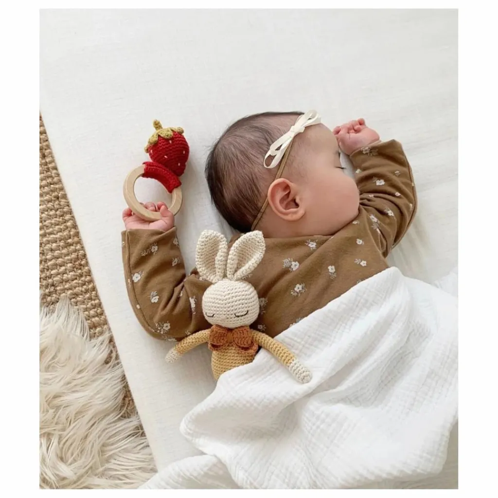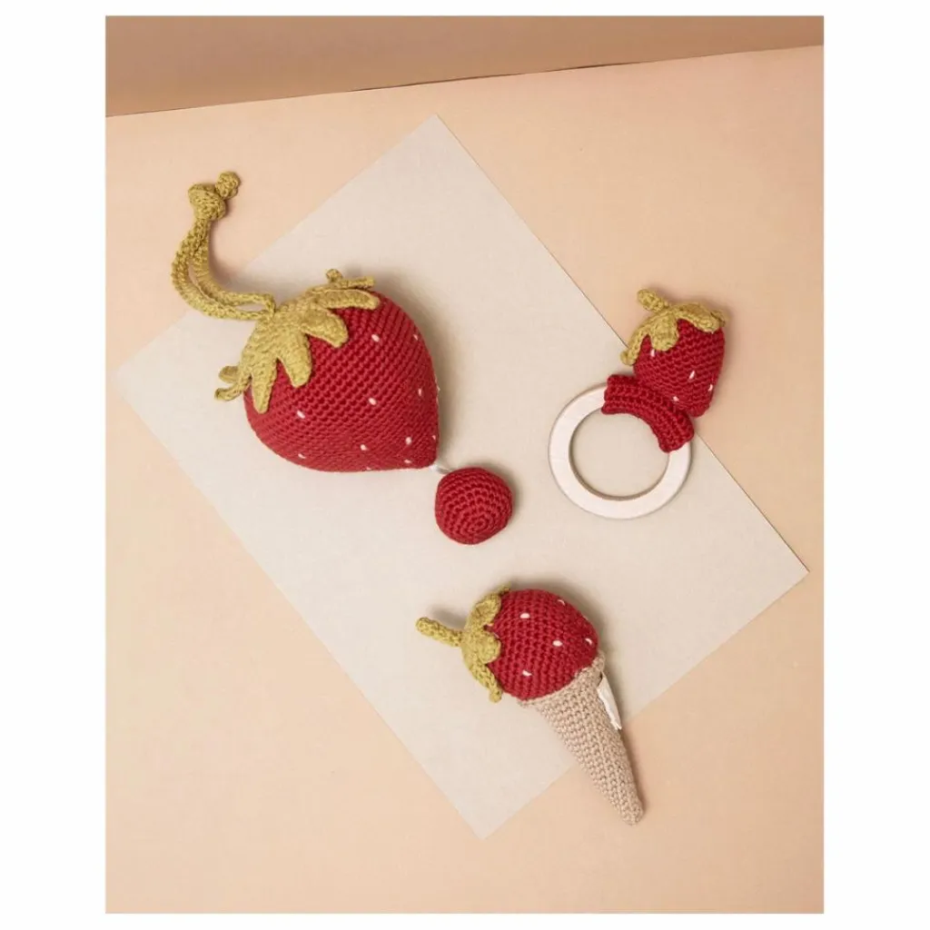 - L’anneau de dentition en forme de fraise soulagera les gencives douloureuses de votre bébé pendant la phase de dentition. Cet adorable jouet sera un compagnon idéal pour votre enfant ! Fabriqué avec soin à la main à partir de coton biologique certifié GOTS. Nos jouets crochetés sont fabriqués avec amour par des artisans talentueux qui utilisent des techniques traditionnelles. Chaque pièce est vraiment unique et porte l’individualité de l’artisan qui l’a fabriquée. Tous nos jouets sont sans danger pour les peaux sensibles. Conçu en Norvège Fabriqué à la main en Turquie – 100% coton biologique – Hypoallergénique et naturellement antibactérien – Teintures éco-responsables et non toxiques – Rembourrage : polyester recyclé (Global Recycling Standard) Conforme aux normes CE Convient dès la naissance Instructions de nettoyage Anneau en bois d’érable naturel. Nous recommandons de le nettoyer à la main avec de l’eau savonneuse. Ne pas utiliser de nettoyants abrasifs ou d’autres techniques de nettoyage et de stérilisation. Laisser sécher à l’air libre. Conserver dans un endroit propre, à l’abri de la lumière et de l’humidité.