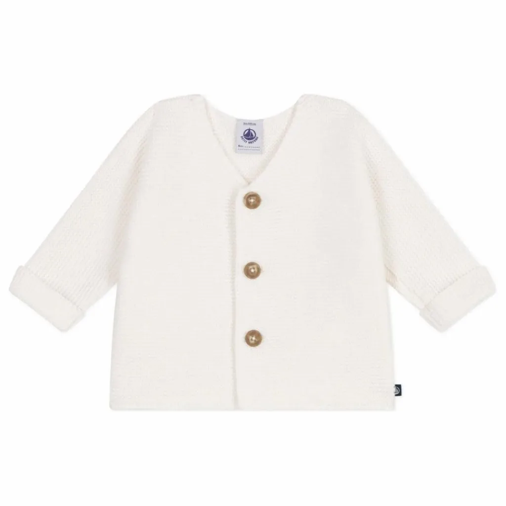 - Unisex moss stitch cardigan: a must-have for babies’ first few weeks! The full-length buttoned fastening at the front makes it very easy to put on.A must-have for your baby’s first few weeks.This little babies’ vest is available in four different colours.