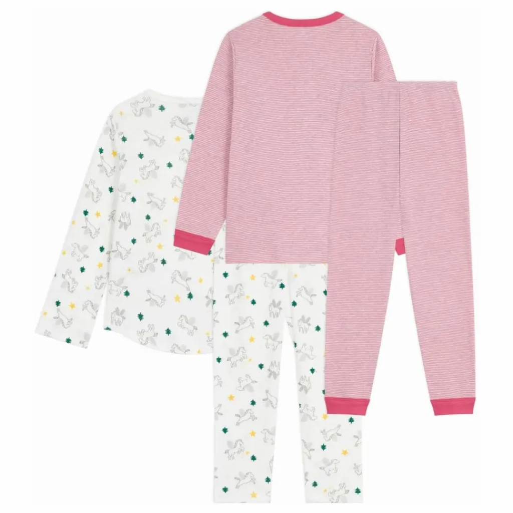 - Le premier pyjama est en côte 1×1 à imprimé féérique. Le second pyjama est en côte 1×1 rayures milleraies.