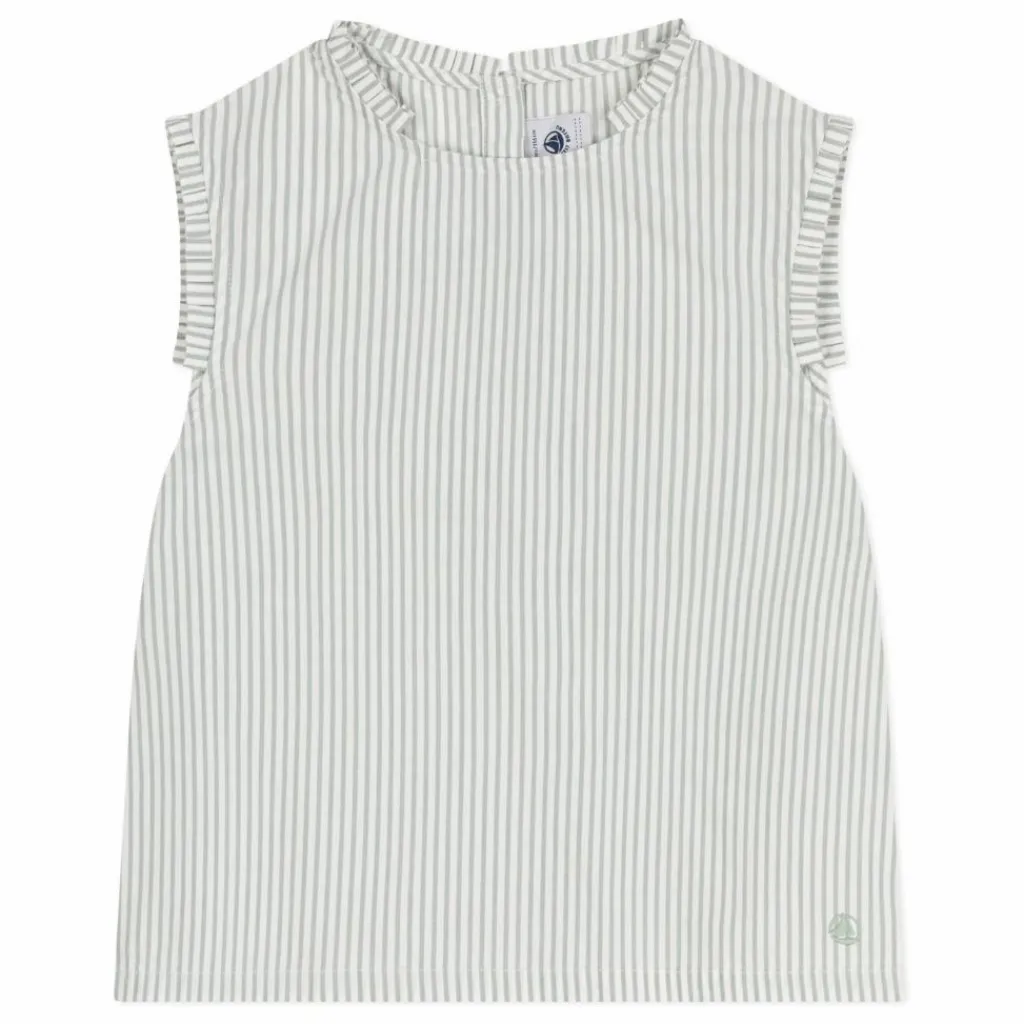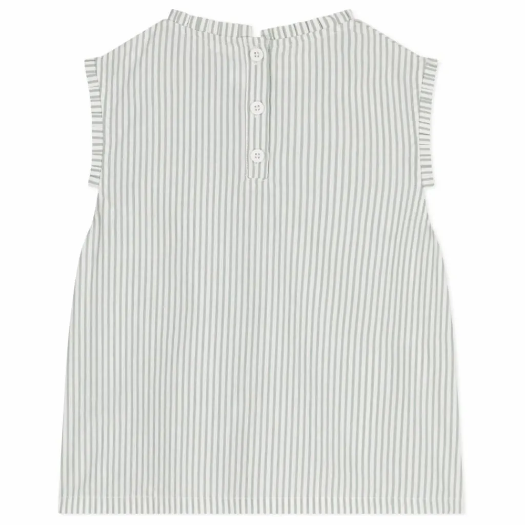 - Chemisier pour fille en tissu rayé fin, doux et léger. Droit avec une encolure arrondie. Joli plissé à l’encolure et aux emmanchures. Fermeture par bouton au dos.