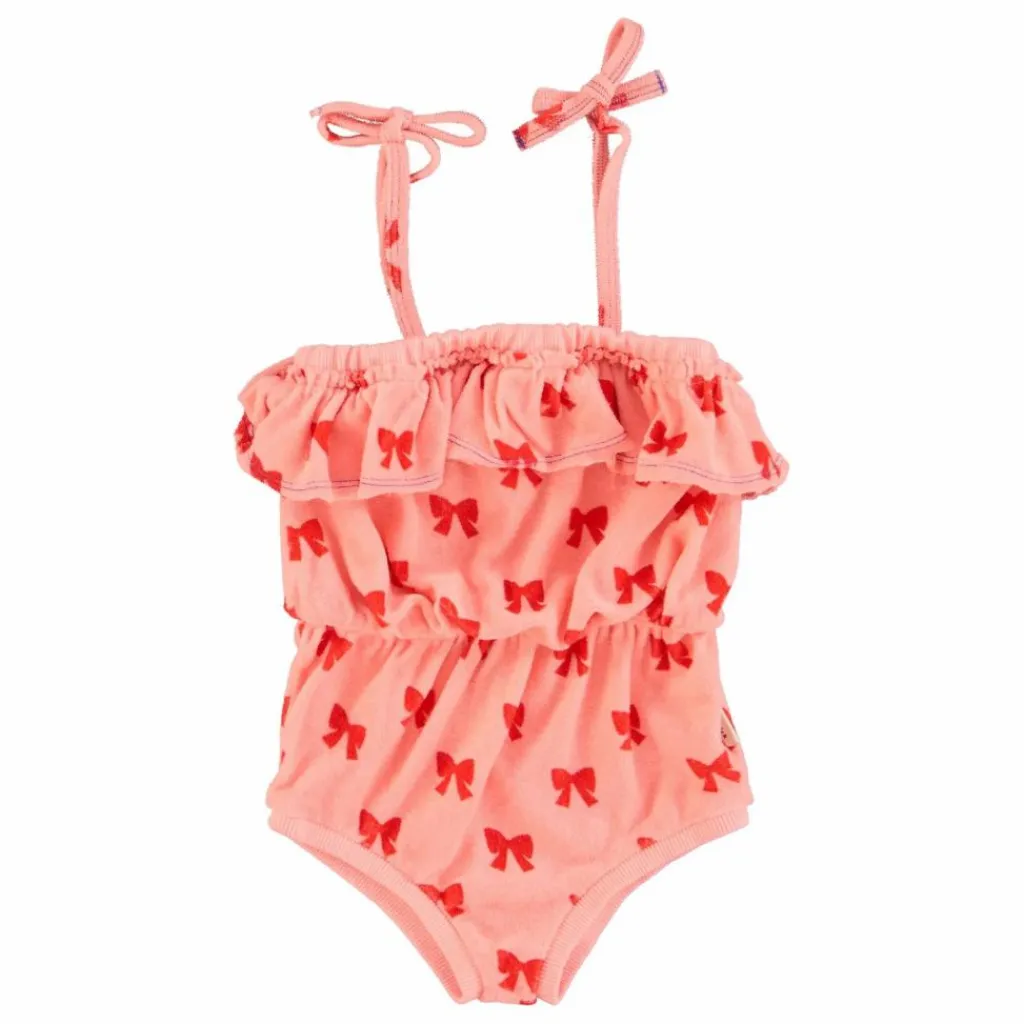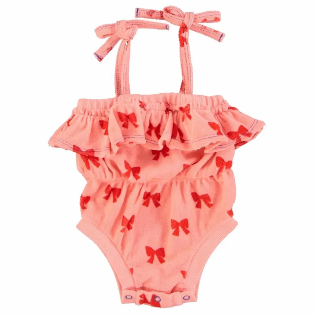 - Combinaison en coton éponge avec fines bretelles à nouer et volant sur la poitrine. Taille élastiquée et plissée. Décorée de nœuds rouges sur l’ensemble du corps.