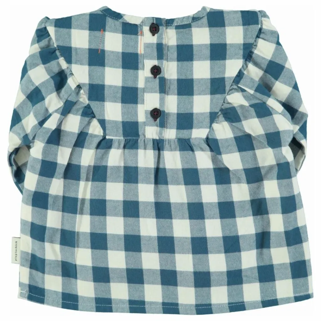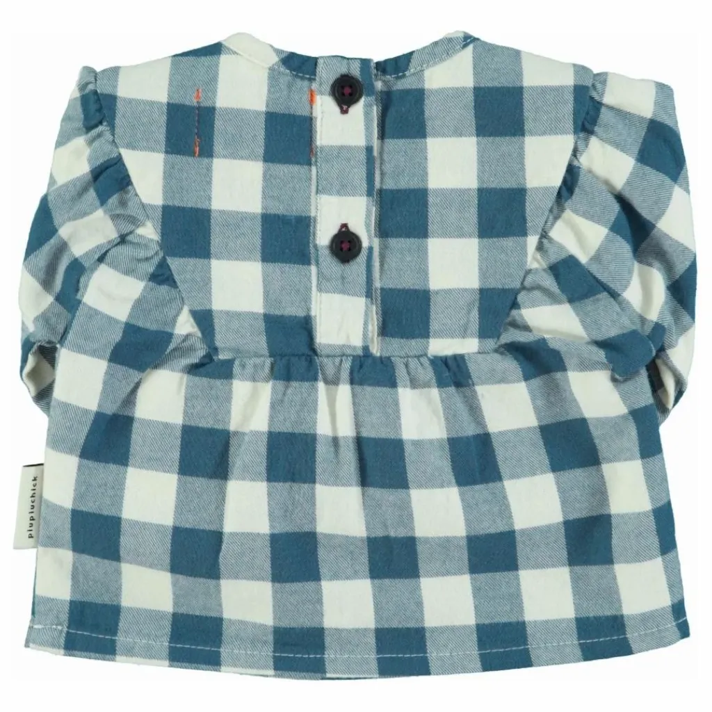 - Chemise à col rond, manches longues et poignets élastiques. Découpe en V sur le devant. Fermeture par boutons au dos.