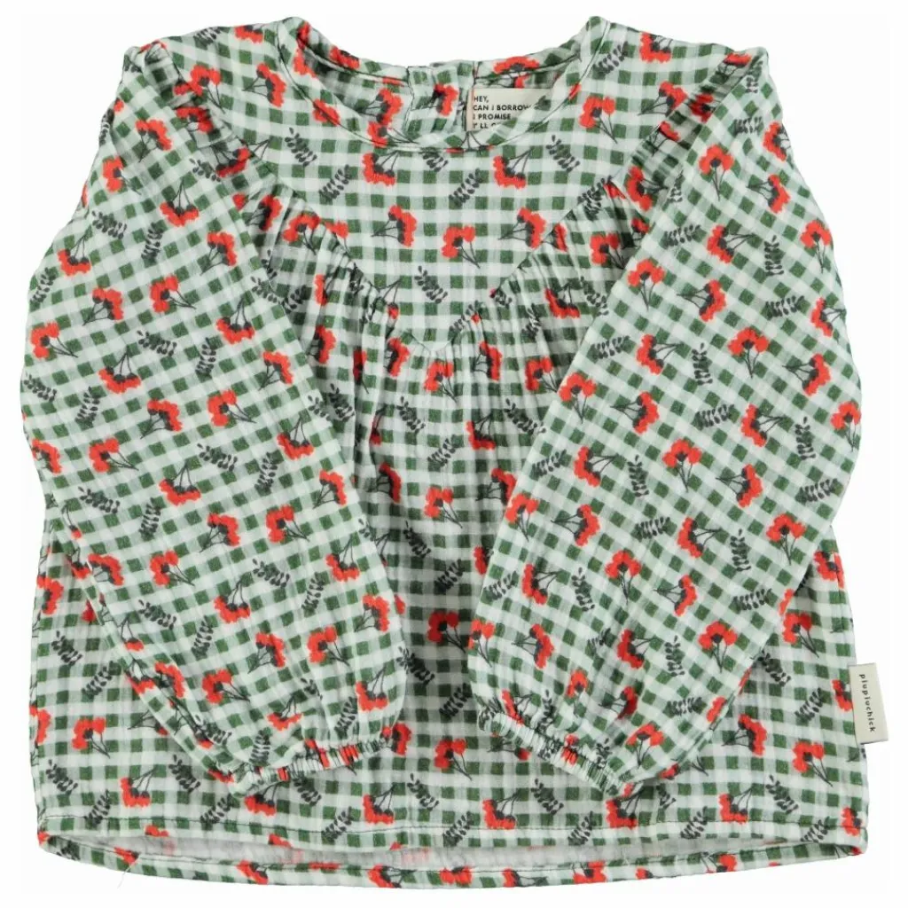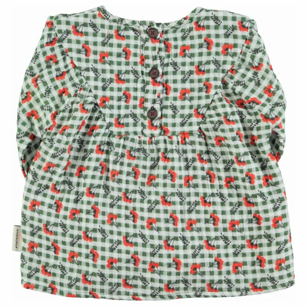 - Chemise à col rond, manches longues et poignets élastiques. Découpe en V sur le devant. Fermeture par boutons au dos.