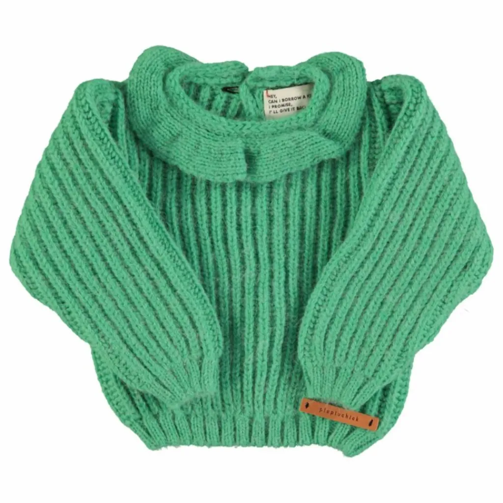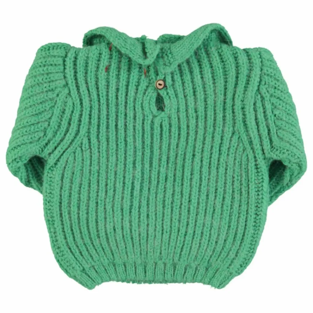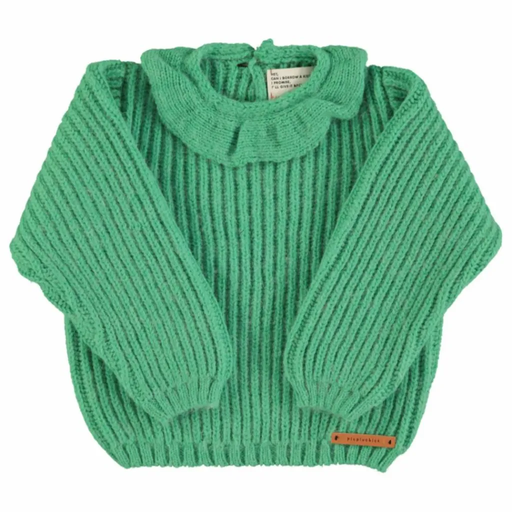 - Knitted sweater with rounded frilled collar and detailed with leather logo label. Multicolor thread. Button on the back.