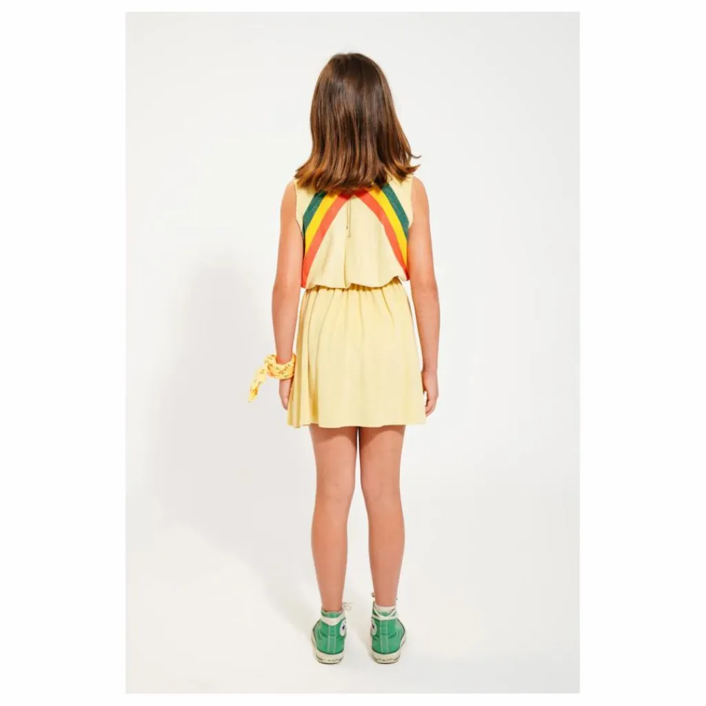 - Robe courte en coton éponge biologique avec encolure ronde et taille élastiquée pour une coupe fluide et plissée. Emmanchures larges à bord brut. Imprimée de rayures multicolores sur le devant et le dos.