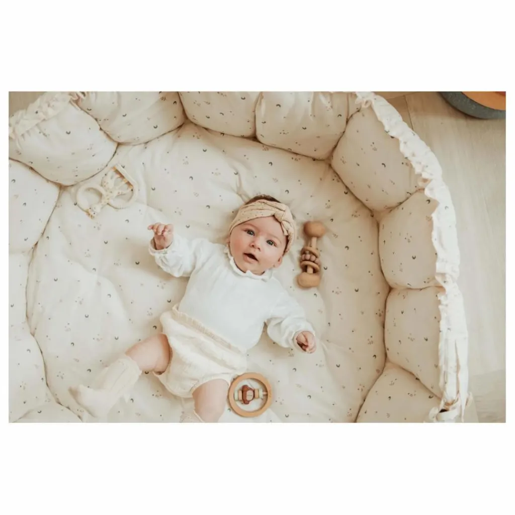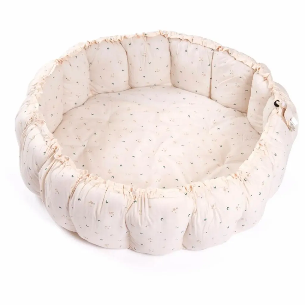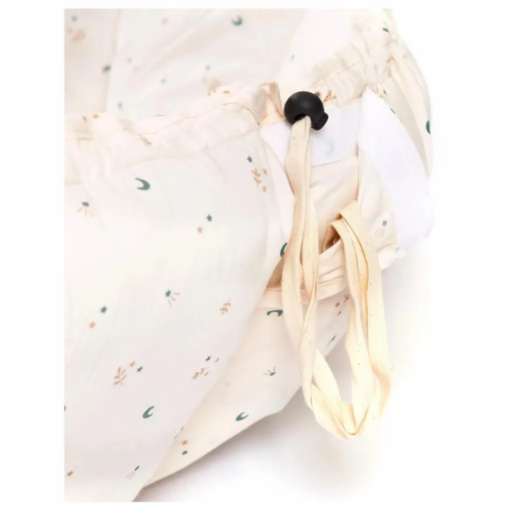 - Pour passer du tapis de jeu au lit de bébé/rangement, soulevez les pétales en tirant doucement sur les ficelles. Insérez toujours la ficelle en coton et le bloqueur de ficelle dans la pochette et fermez-la bien.