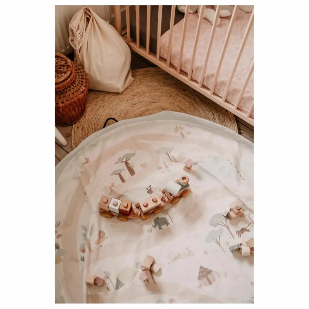 Pratique et léger, ce sac se glisse dans un grand sac à dos, une valise ou se porte simplement seul. Vos enfants seront ravis de pouvoir emporter avec eux leurs jouets. Fabriqué dans un coton très solide, ce sac peut également servir de tapis de jeux.