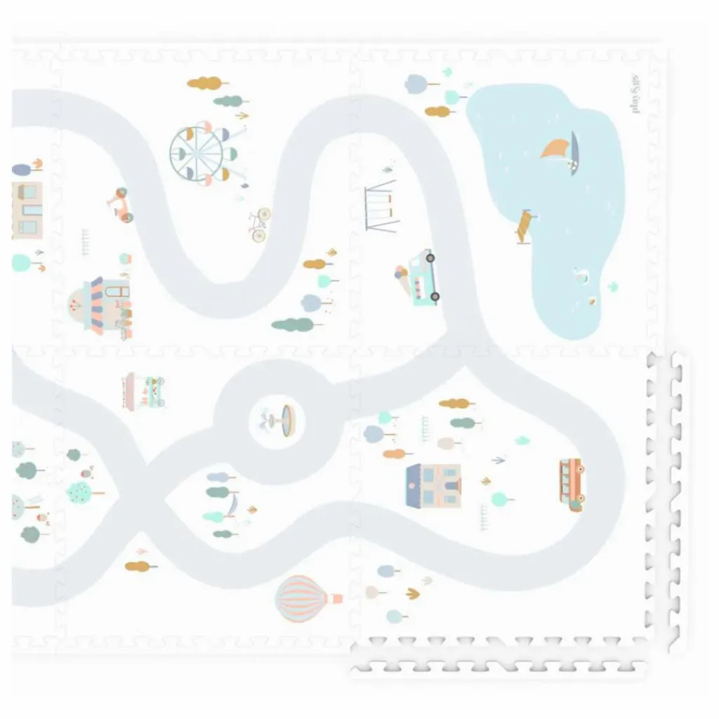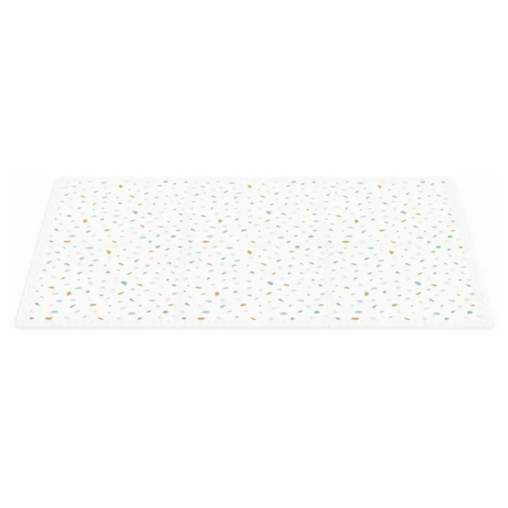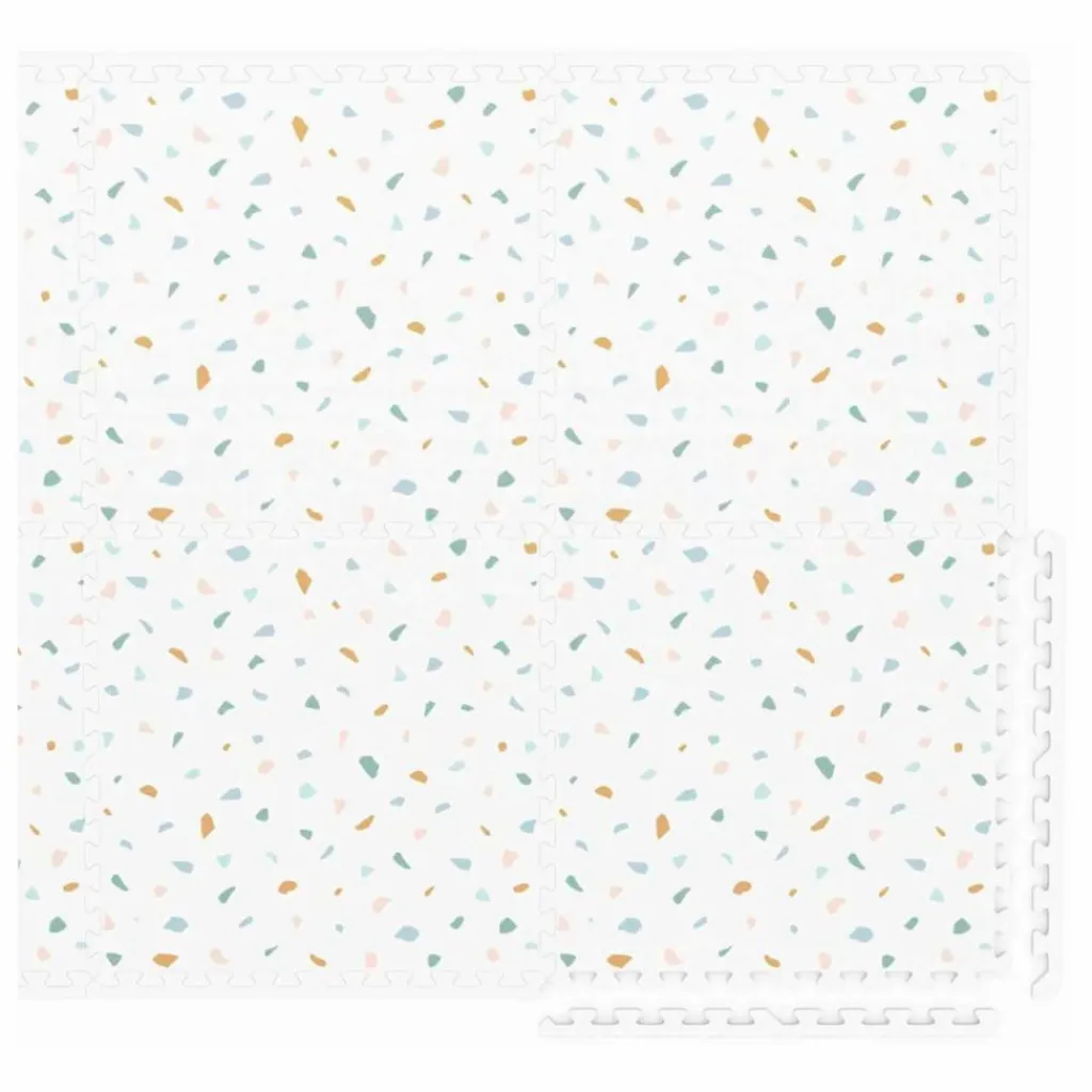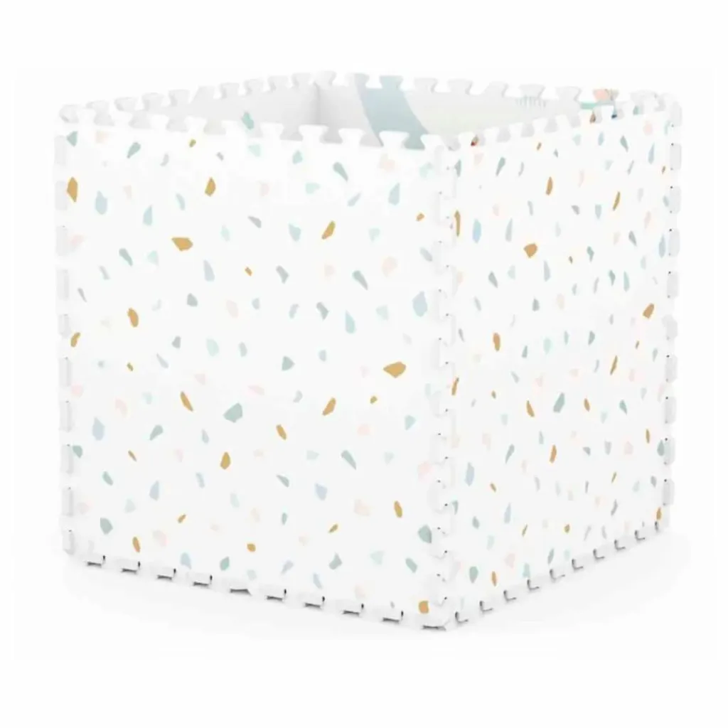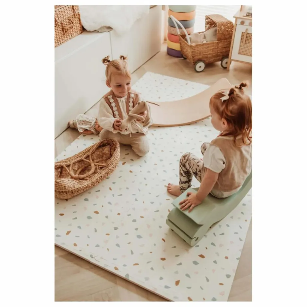 La magie opère : Plongez dans l’univers du « Village », où chaque retournement de ce tapis de jeu réversible vous introduit dans un nouveau royaume de créativité. D’un côté, vous trouverez une délicieuse tapisserie pastel ornée de scènes fantaisistes – une fontaine tranquille, de gracieux ballons aériens flottant dans le ciel, un bord de lac serein et de charmantes boutiques pleines de vie. De l’autre côté, vous serez accueilli par l’attrait d’un paradis pastel aux motifs complexes inspirés d’une mosaïque en terrazzo.