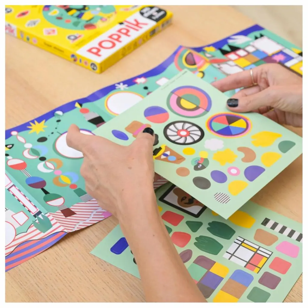 Les enfants s’amuseront à composer 3 grandes images en collant les stickers sur le décor, ils découvriront ainsi de nombreuses couleurs, formes et mises en scène de l’art moderne… Une activité qui ne tache pas, pour faire travailler ses dix doigts !