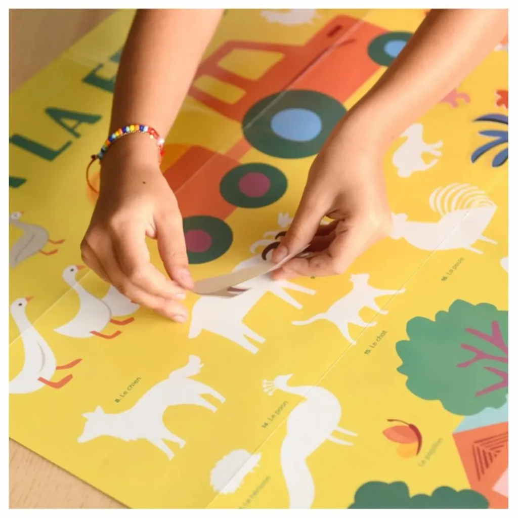 Sur un poster pédagogique coloré vos enfants collent des stickers en composant ainsi tout l’univers de la ferme avec les animaux, le tracteur, les personnages et les outils. L’enfant pourra ainsi apprendre le vocabulaire de la ferme et se passionner pour ce sujet.