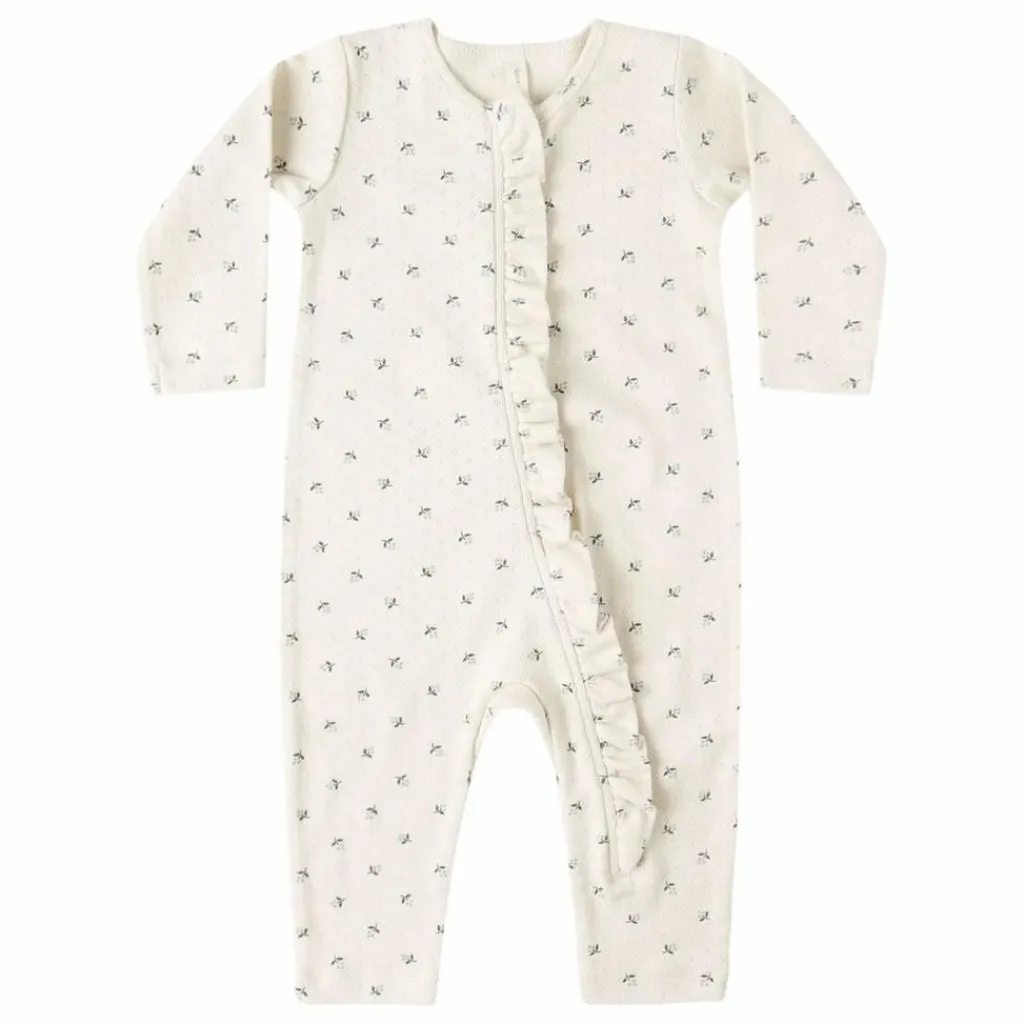 - Cette douce combinaison en pointelle est ornée de volants délicats le long de la fermeture éclair, alliant confort douillet et charme intemporel.