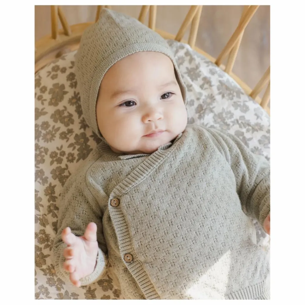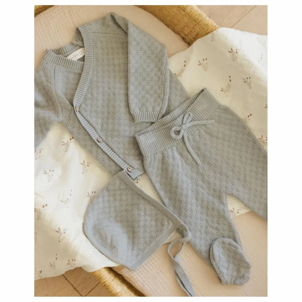 - Ce haut en tricot avec bordures côtelées et bouton en forme de noix de coco est associé à un pantalon à pieds en tricot avec un nœud fixe à la taille – l’ensemble parfait pour vos petits.