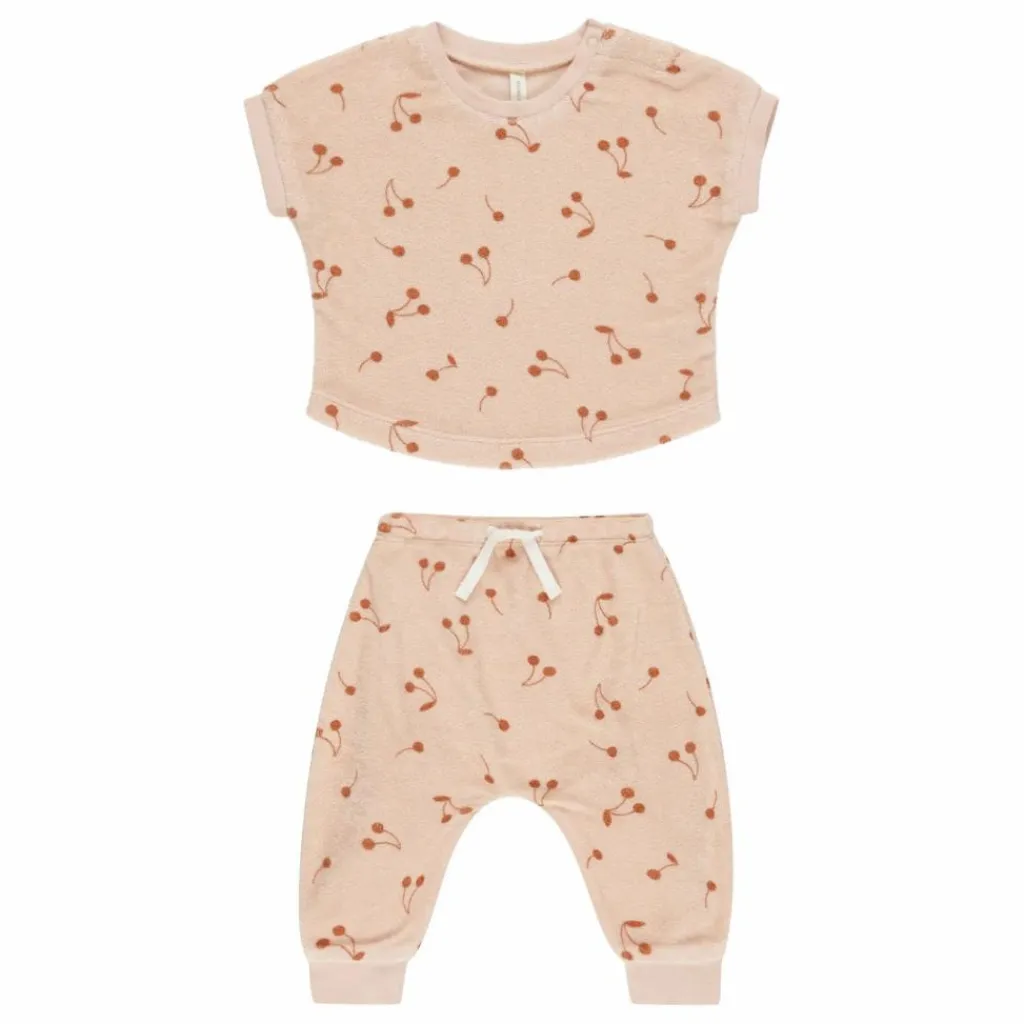 - Notre ensemble tee-shirt et pantalon en éponge est exactement ce qu’il vous faut pour toutes vos aventures ce printemps. Le tee-shirt se ferme à l’aide d’un bouton-pression pour un port facile et le pantalon est doté d’une taille élastique, d’un cordon de serrage et d’ouvertures côtelées au niveau des jambes pour un ajustement parfait.