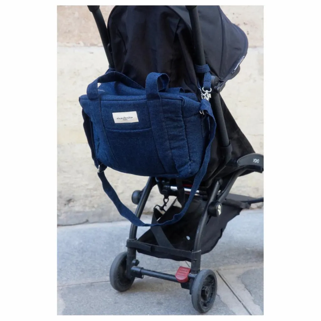 - Poche extérieure plaquée sur le devant du sac pour glisser son téléphone, poche intérieure plaquée pour les couches, et une poche resserrée par un élastique pour le biberon. Anse réglable pour le porter à l’épaule ou en bandoulière.