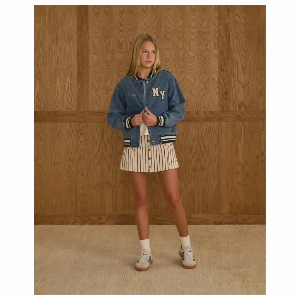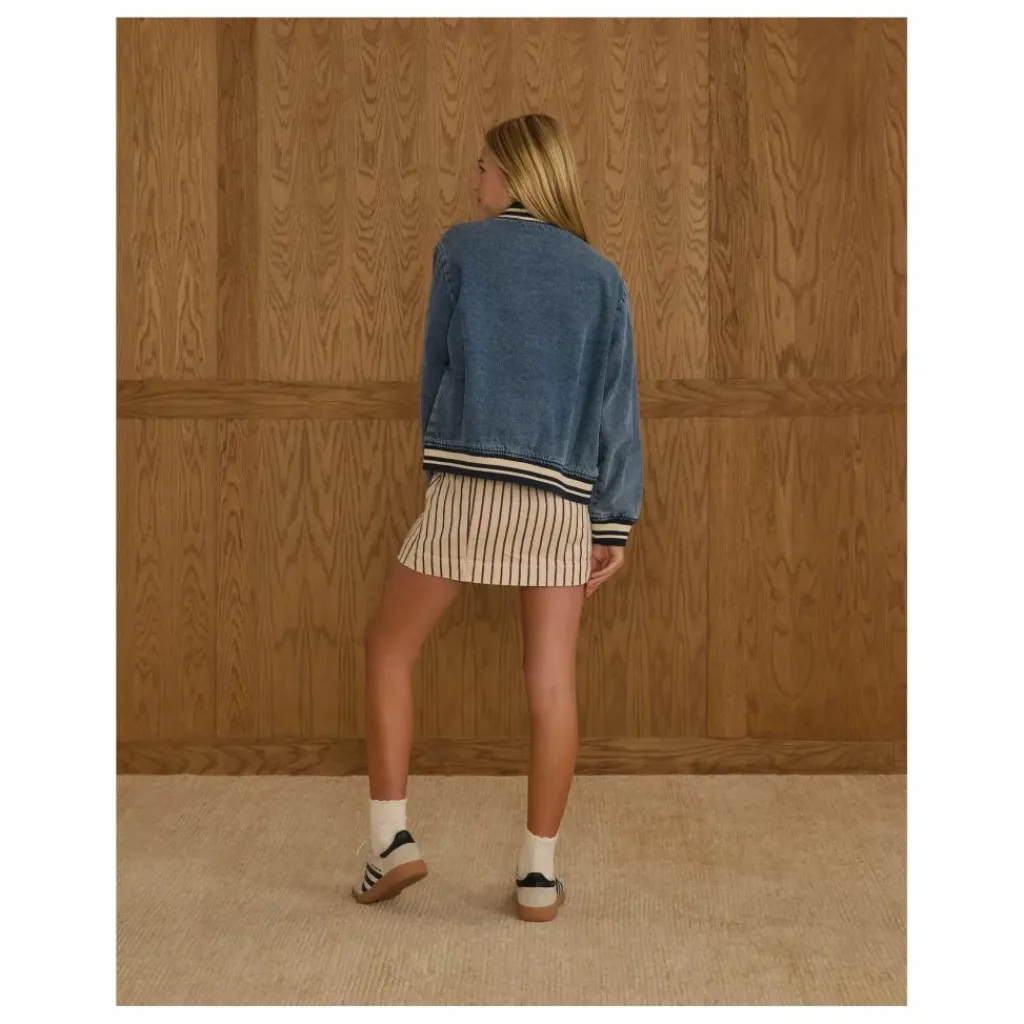 - Notre veste Varsity Jacket apporte toutes les vibrations de la préparation vintage, avec des côtes rayées au niveau du col, des poignets et de l’ourlet, des boutons-pression en métal enduit, des poches latérales et une doublure en coton doux. Un classique qui ne manquera pas de faire mouche, avec notre broderie « champ » et notre écusson « NY » sur notre denim « indigo ».