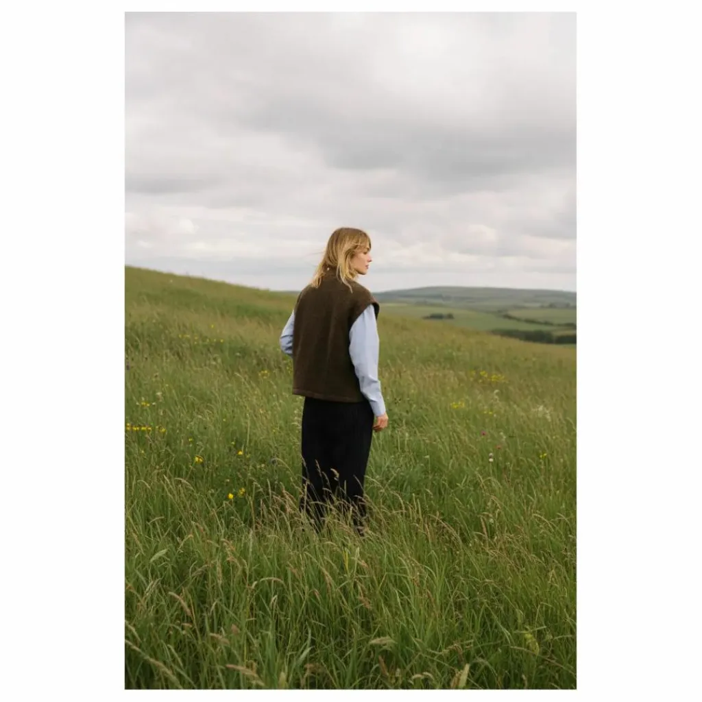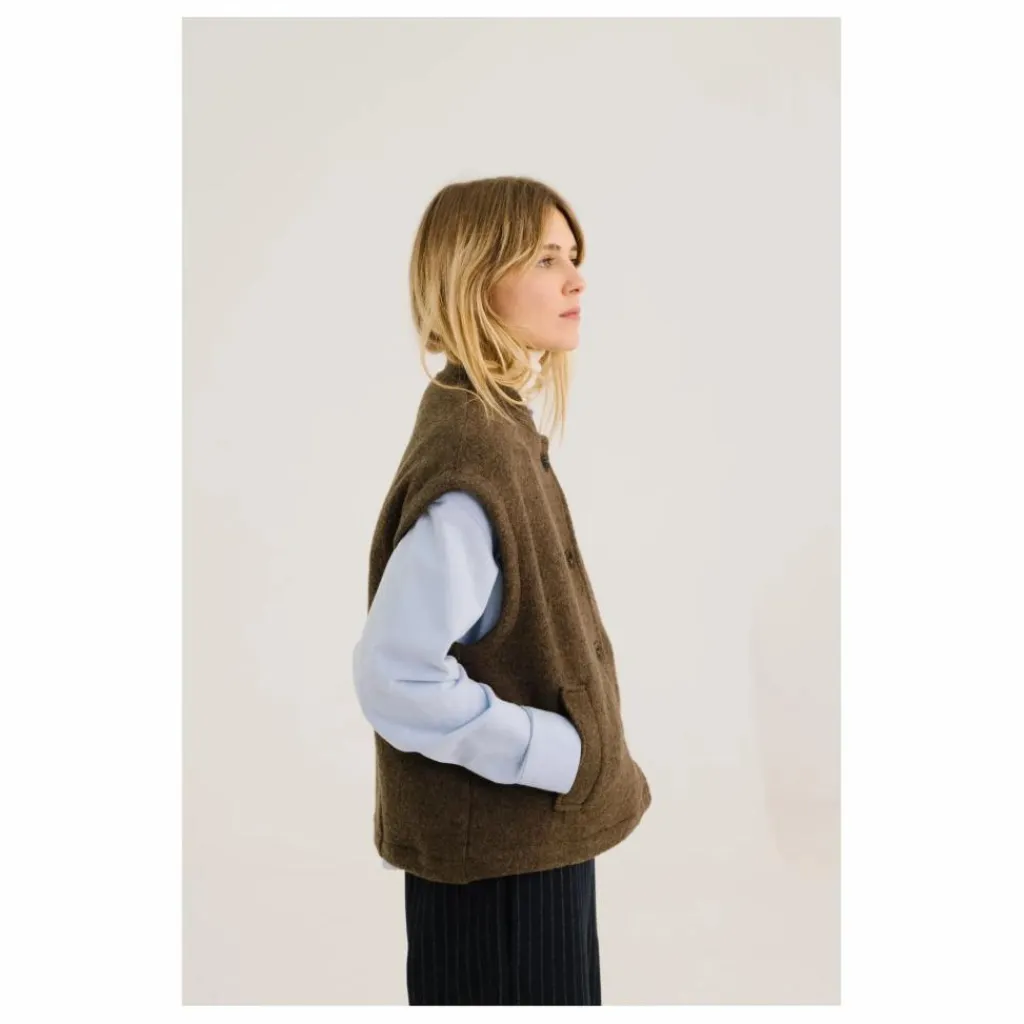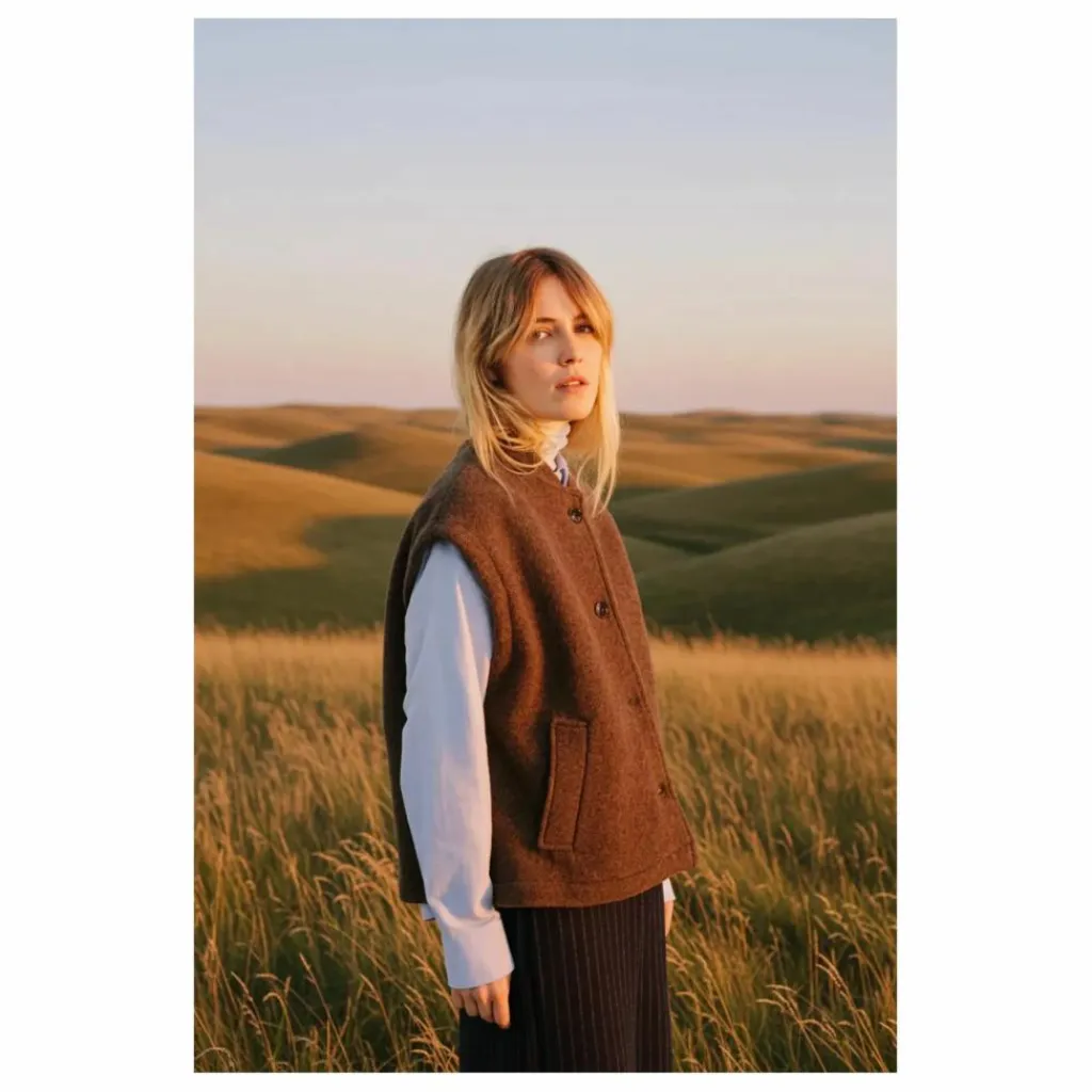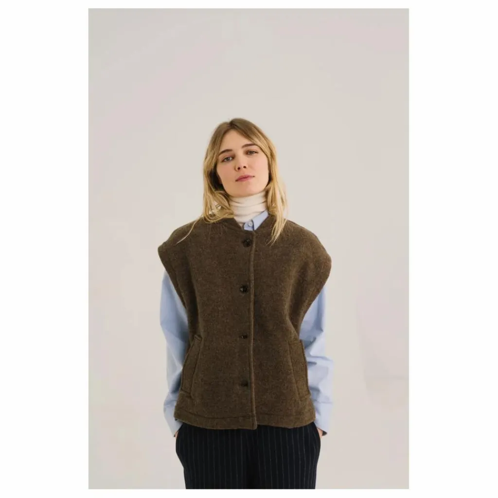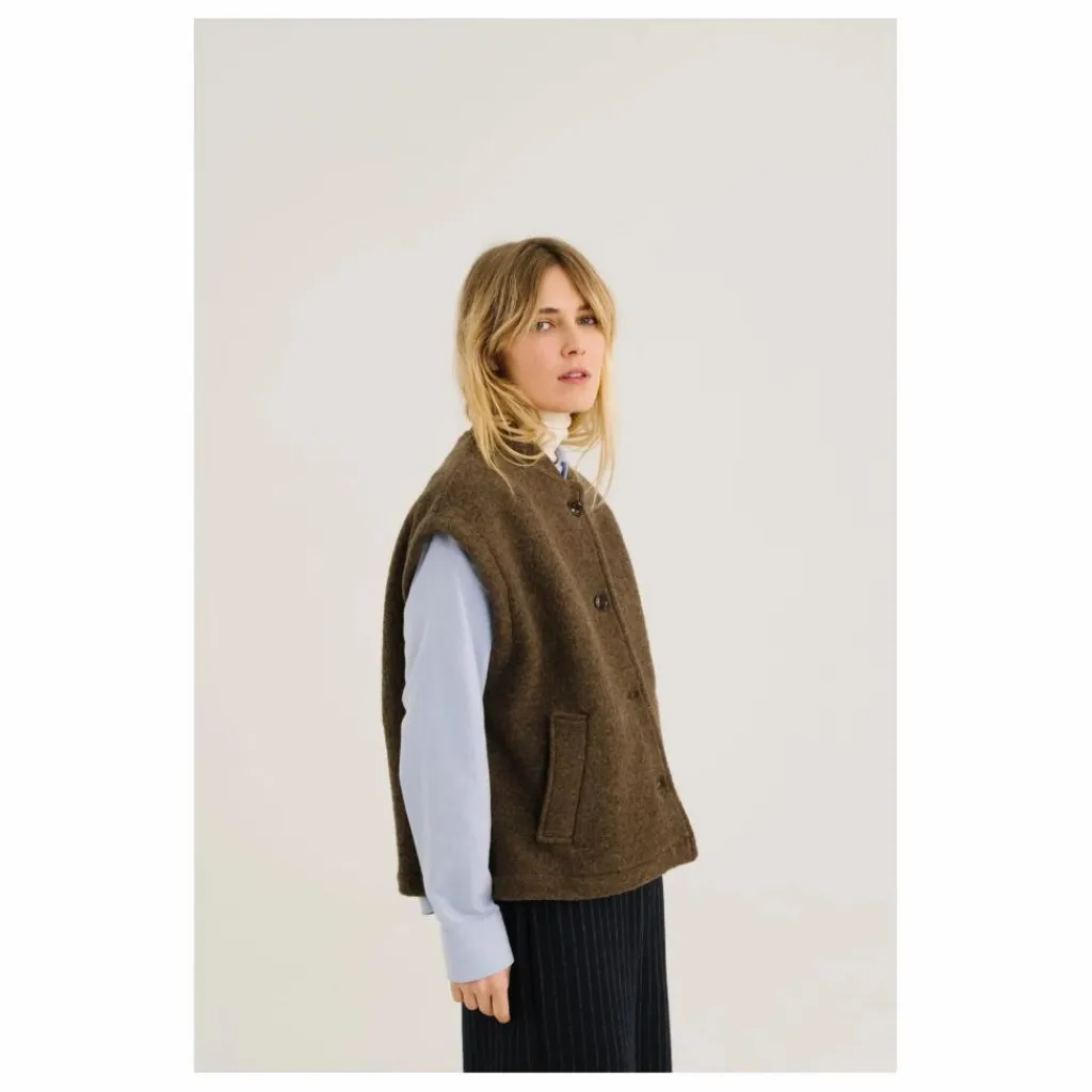 - Veste ronde sans manches en laine marron clair, non doublée pour un porté léger et naturel. Sa coupe oversize est structurée par des pinces dans le bas du dos et sublimée par un col style bomber. Dotée de larges poches passepoilées et d’un boutonnage apparent, elle allie volume, confort et allure contemporaine.