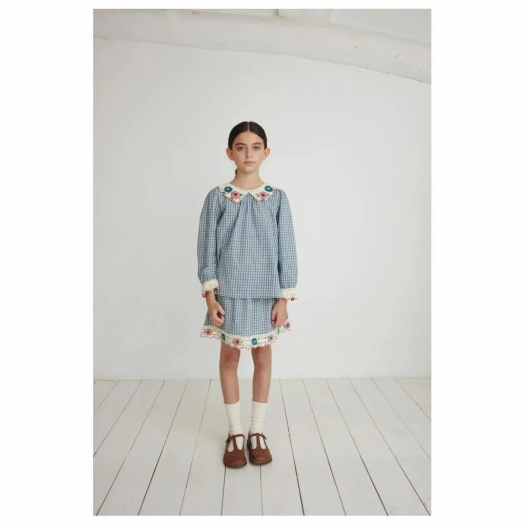 - L’adorable jupe Rhea est fabriquée dans le tissu de coton le plus doux avec un imprimé à carreaux bleus. La jupe Rhea présente une silhouette évasée, une fermeture à glissière sur le côté et d’adorables détails en crochet faits à la main sur l’ourlet.