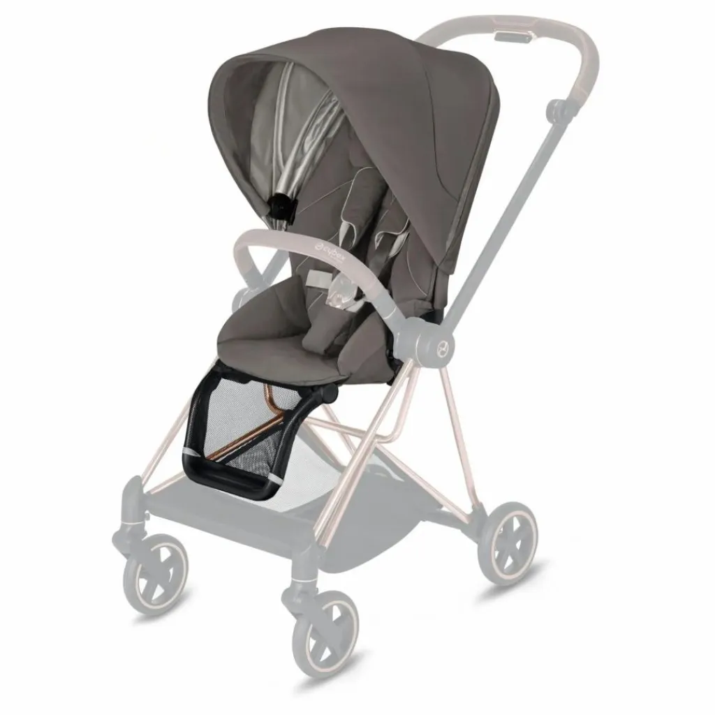 Habillage siège Mios : Dossier en filet, Harnais à une sangle, Inclinaison et pliage d’une main, Suspension intégrale, Siège réversible, Canopy pare-soleil XXL, Repose-jambes réglable.