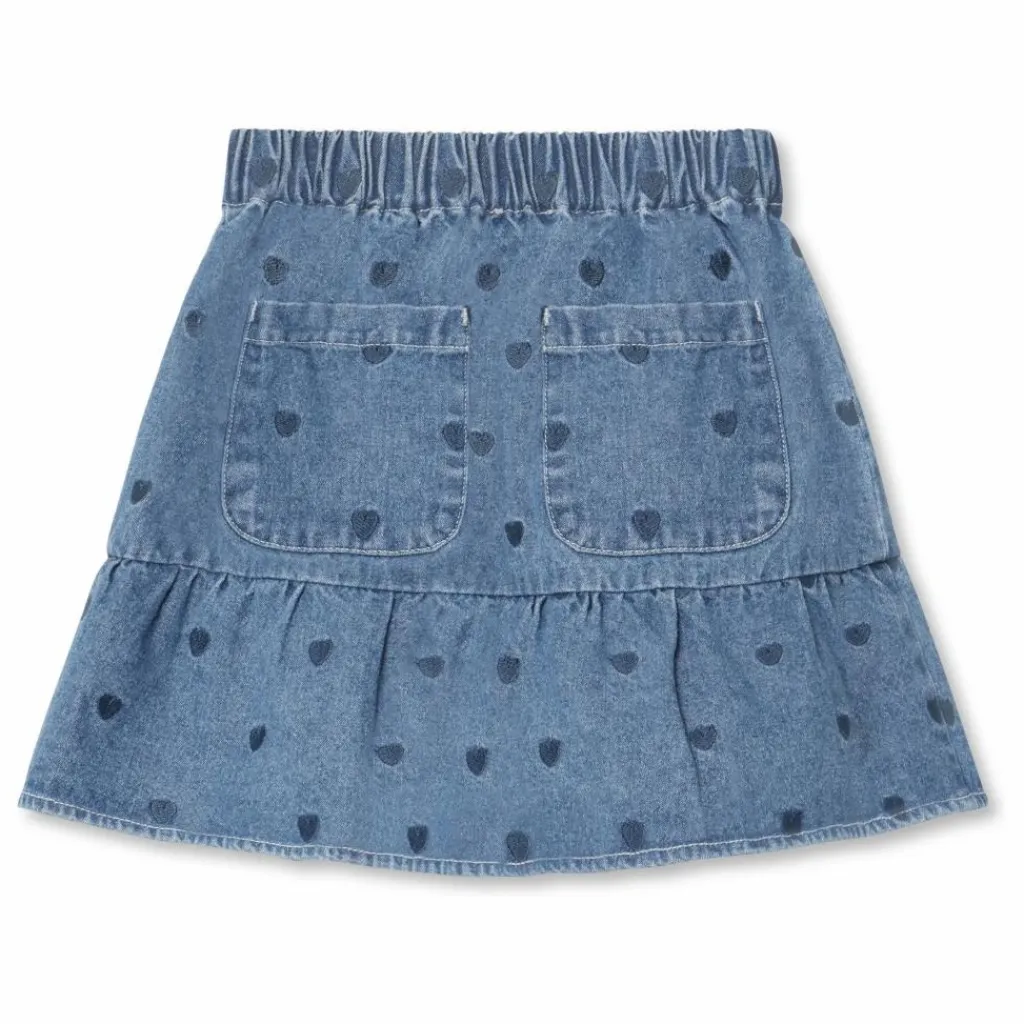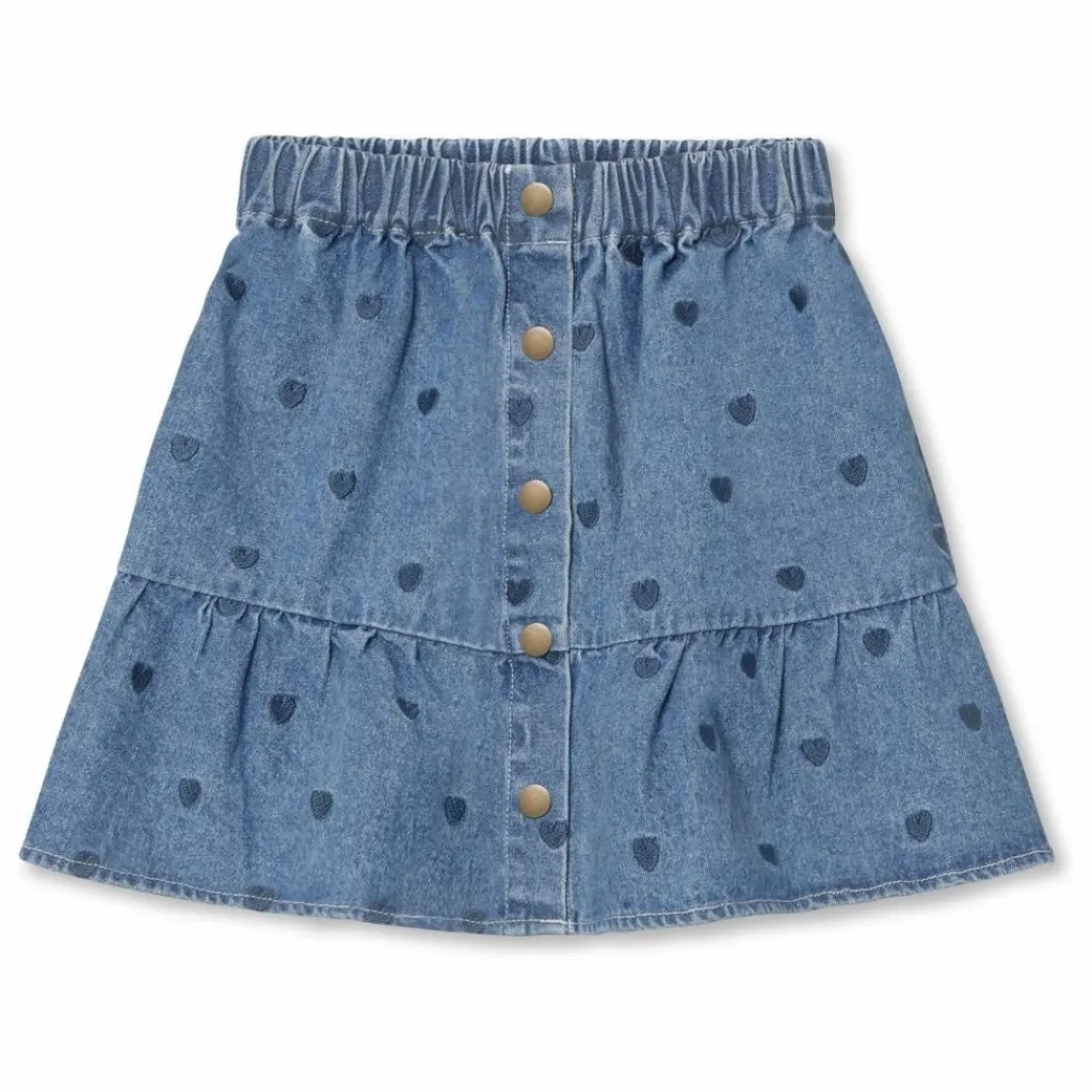 - Jupe en denim avec cœurs brodés. La jupe est munie de boutons-pression sur le devant et d’une découpe au bas pour créer du volume. Elle donne une jolie forme de tulipe.