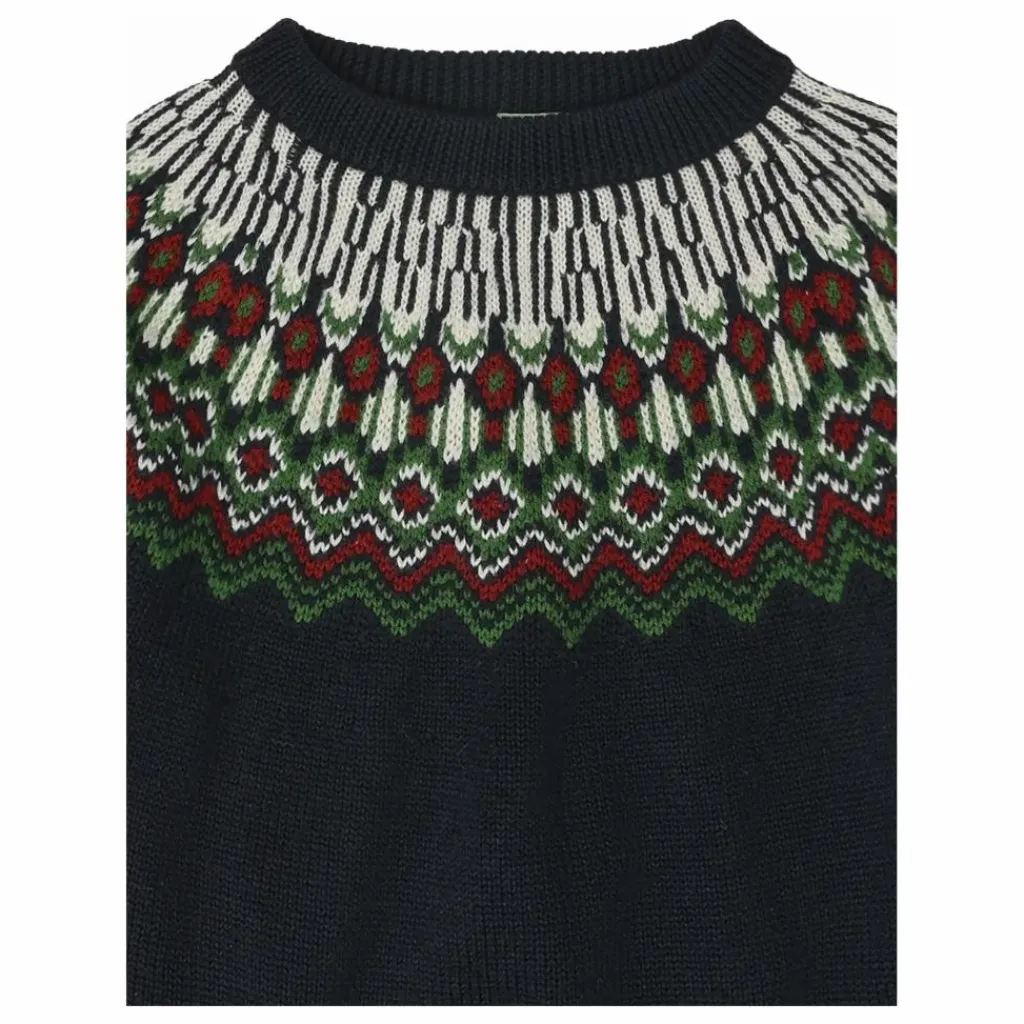 - Confectionné en laine mérinos douce, ce pull à manches longues présente une coupe légèrement ample. Il présente une encolure ronde, des manches raglan et un panneau graphique en haut, inspiré des motifs traditionnels de tricot Fair Isle. Le pull est tricoté en un seul jersey. La laine mérinos est certifiée BLUESIGN® et RWS, exempte de produits chimiques nocifs, et provient de moutons non mulets.