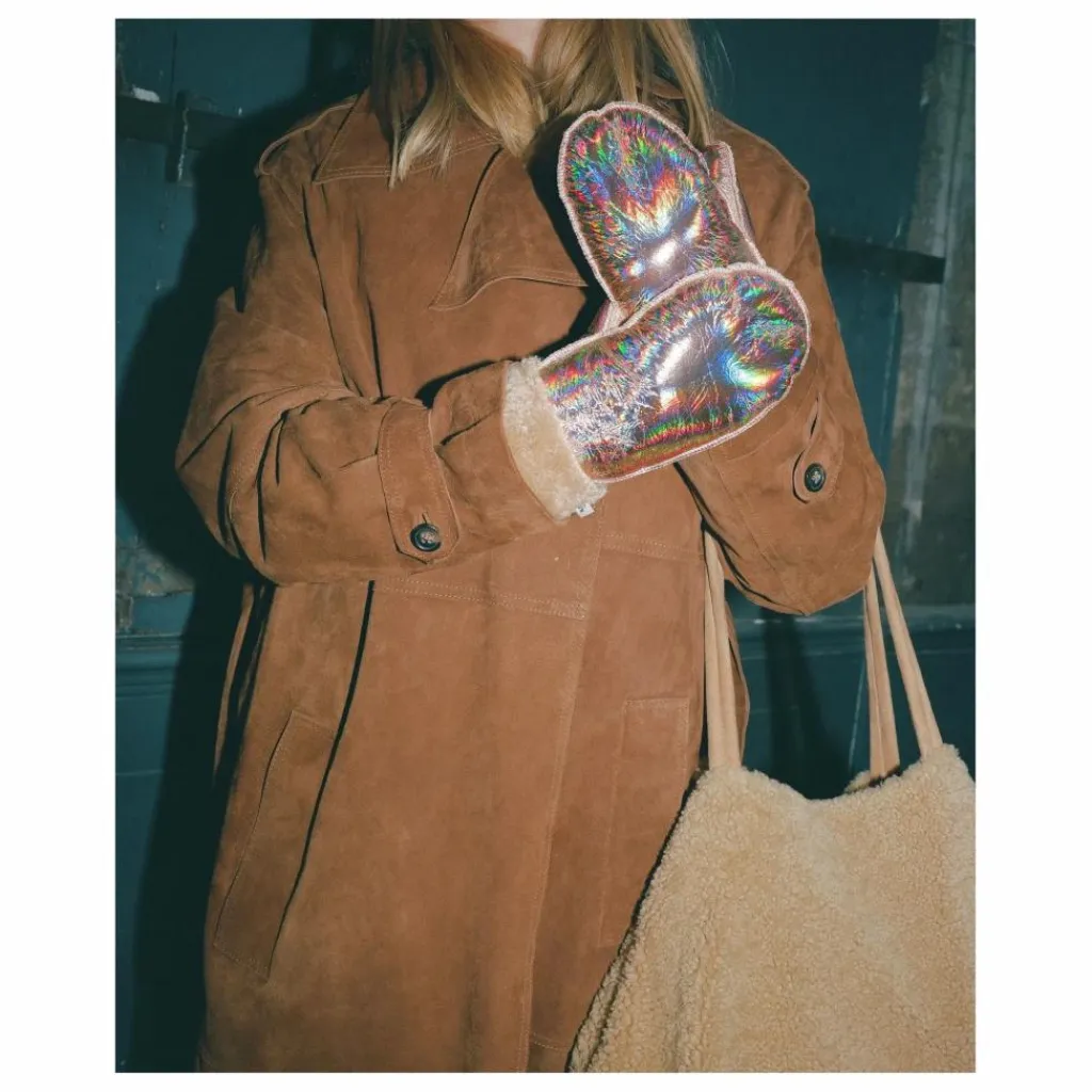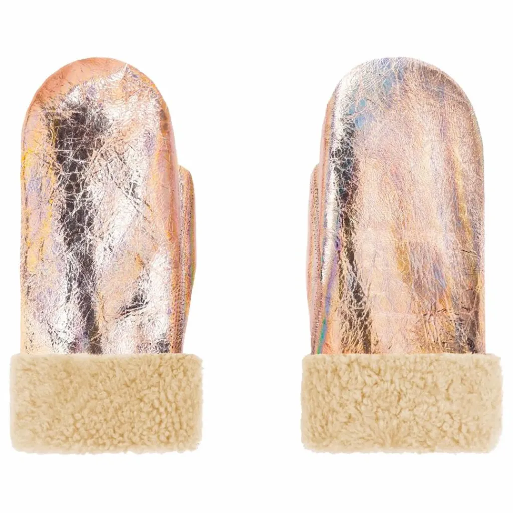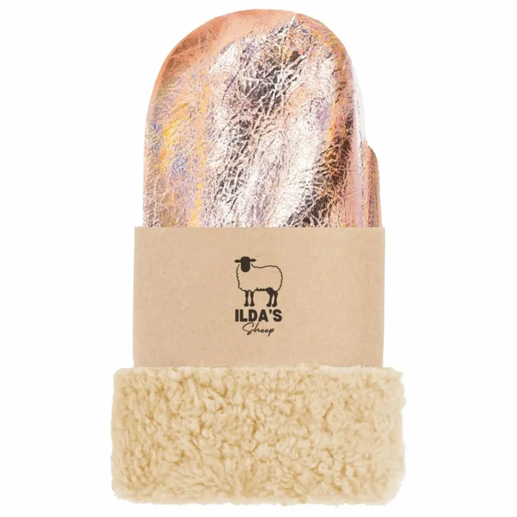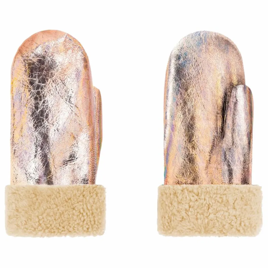 - moufles en peau lainée métallisée, poignet en peau lainée, ajustement par bouton pression, couture et finition ton sur ton