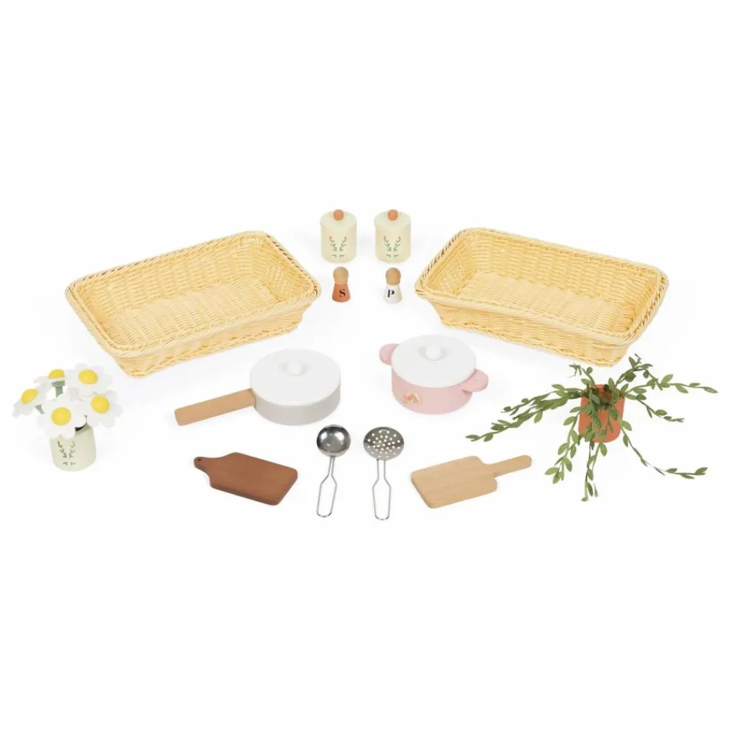 - 1 cuisine, 2 pots à épices, 1 poivrière, 1 salière, 1 écumoir, 1 louche, 2 planches à découper, 1 poêle, 1 casserole, 2 couvercles, 1 plante verte, 1 vase, 5 fleurs, 2 panières