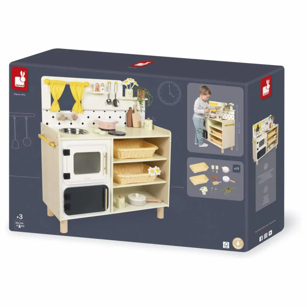 - Des invités arrivent, vite, tous en cuisine ! Cette grande cuisine à tout ce qu’il faut pour préparer un bon dîner : 1 poêle et 1 casserole avec leur couvercle, 1 louche, 1 écumoire, 2 planches à découper, 1 salière, 1 poivrière, 2 pots à épices, 1 vase avec 5 fleurs, 1 plante verte, ainsi que deux grandes panières pour pouvoir ranger tous les ustensiles. Il est possible de faire griller ou mijoter des plats sur les plaques et régler la température grâce aux boutons rotatifs et sonores placés à côté. Pour les plus gourmands, la cuisine est équipée de deux fours, il est donc possible de faire griller de la viande dans un et laisser cuire un gâteau dans l’autre ! Une fois la cuisine terminée, place à la vaisselle, heureusement il y a un grand évier et un robinet avec boutons rotatifs pour pouvoir ajuster la température ! Jouet d’imitation en bois FSCTM. Jouet pour les enfants à partir de 3 ans.