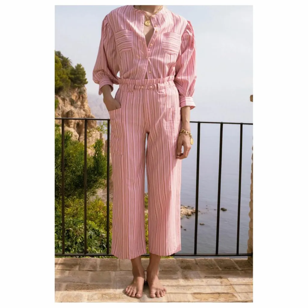 - Le pantalon Francesco est superbe. Il est fabriqué dans un tissu très spécial, dans un ton rose très doux et avec des rayures rouges. Il contient du lurex, ce qui permet d’apprécier une brillance très subtile. Sa taille froncée en fait un modèle qui s’ajuste parfaitement au corps. Vous allez l’adorer.