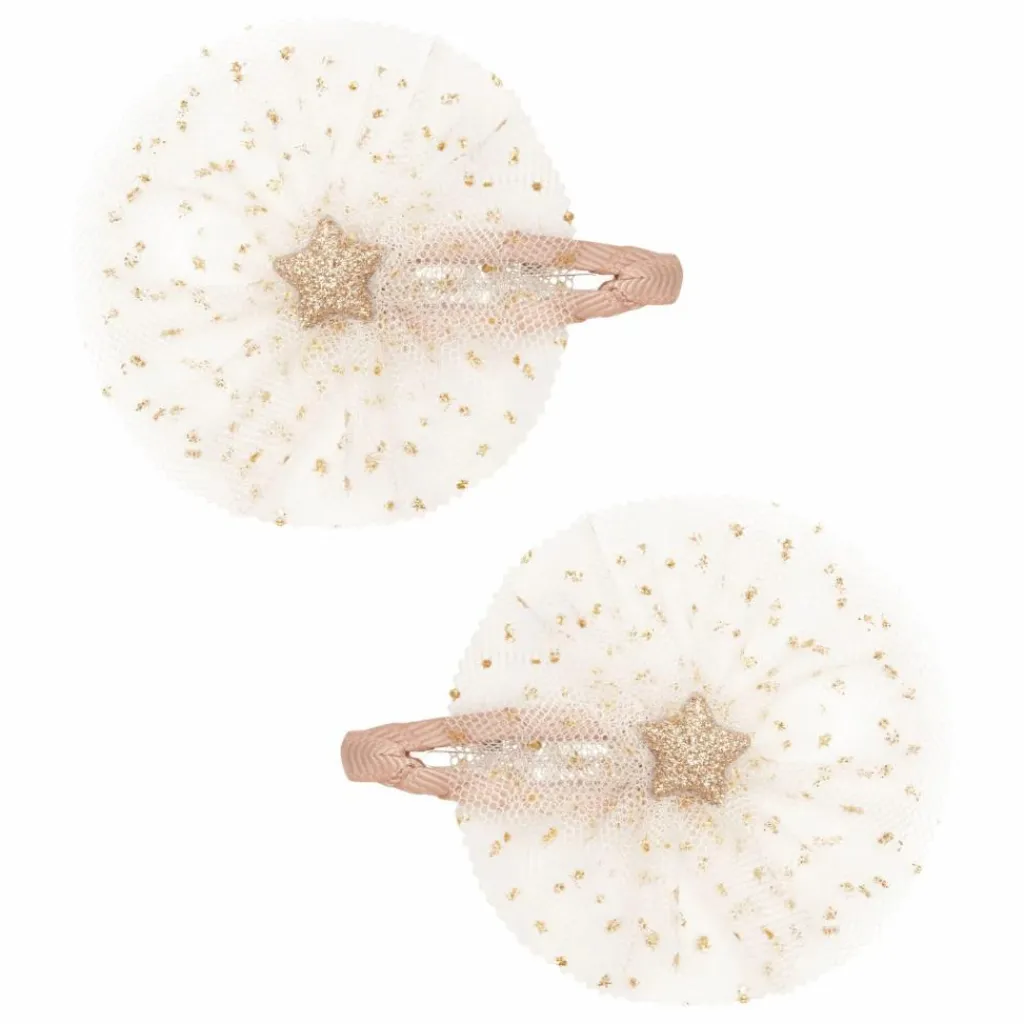 - La paire de pinces parfaite pour toute danseuse étoile ! Avec leurs délicates couches de tulle moucheté d’or, elles sont sûres de garder leurs cheveux en pointe ! 2 par paquet Clips de 5 cm enveloppés de ruban gros-grain Couches de tulle doux moucheté de paillettes, ornées d’une étoile centrale en paillettes d’or Avertissement ! Ne convient pas aux enfants de moins de 36 mois