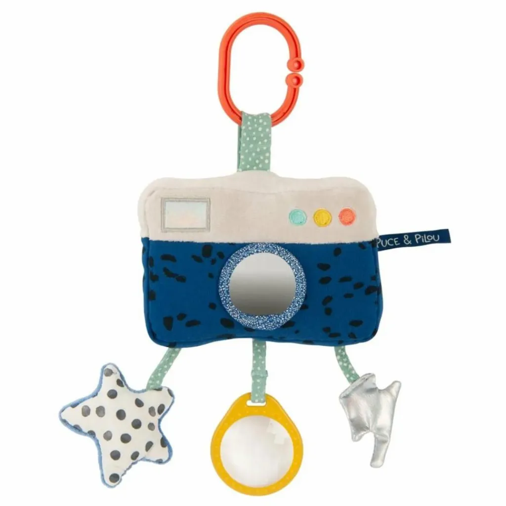 - Appareil photo à suspendre plein de surprises ! Des rubans à attraper, un miroir pour s’observer ou encore des grelots à secouer pour se dandiner.